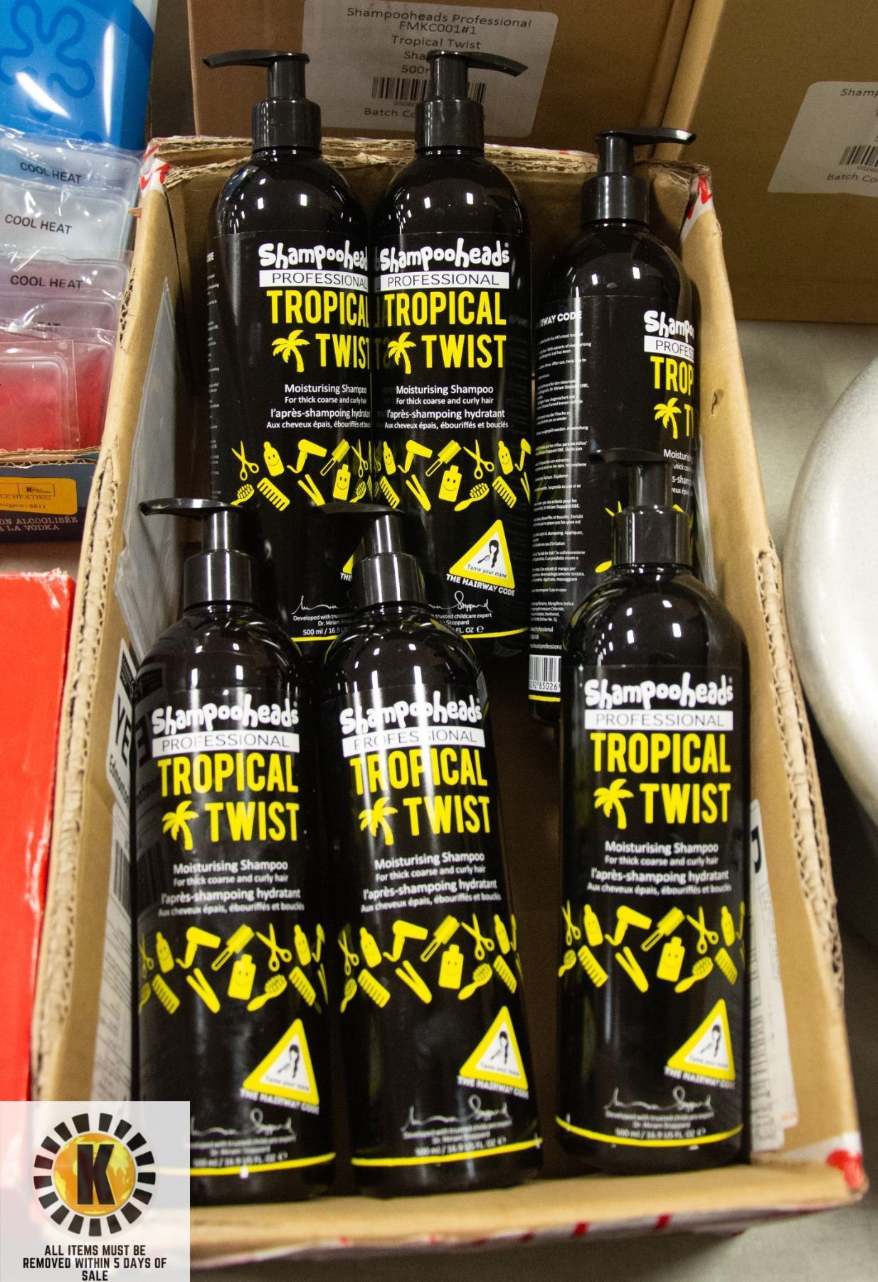 6 BOTTLES OF SHAMPOOHEADS PROFESSIONAL TROPICAL TWIST MOISTURIZING SHAMPOO FOR THICK OR CURLY HAIR. 500ML PER BOTTLE. ALL ITEMS MUST BE REMOVED WITHIN 5 DAYS OF SALE**SHIPPING NOT AVAILABLE** ALL ITEMS MUST BE REMOVED WITHIN 5 DAYS OF SALE