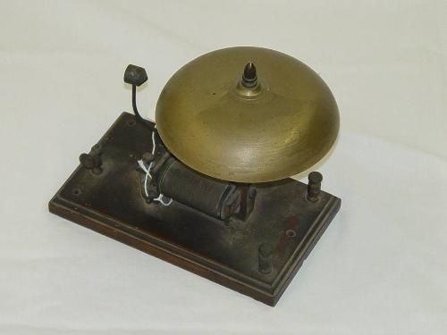 6" BRASS TAPPER BELL MOUNTED ON 8 1/2" X 5" WOODEN WALL BRACKET - NORMAL WEAR