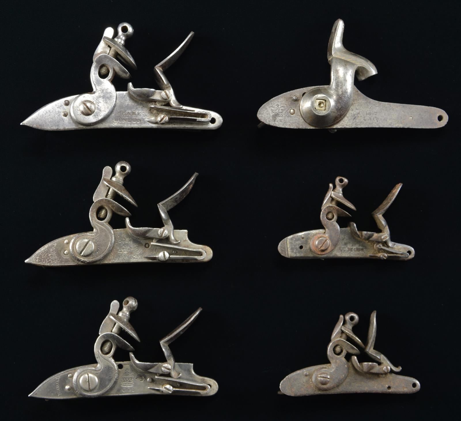 1) A late 18th century flintlock mechanism with "BLAKE LONDON" marked in front of the cock. The cock is a reinforced style and may be for a sea service pistol or a carbine. The interior of the lockplate is stamped "ID". CONDITION: lock has a medium gray patina with superficial pitting. Lock appears to function properly. 2) A mid-19th century percussion lock marked with a crowned "VR" in back of the hammer and "1862 L.A. CO." in front of the hammer. The hammer has engraved decoration near the top, but the lock is plain. The interior of the lock is marked "L.A.C" on the sear & bridle. CONDITION: lock has a medium gray overall patina. The hammer screw appears to be broken off. 3) A mid to late 18th century flintlock mechanism. The lockplate is marked "TOWER" behind the cock, and crown over "GR" in front. There is also a small crowned broad arrow adjacent to the previous marking. Both the lock and the cock have lineal embellishments. The interior of the lock is marked with a crowned "5". CONDITION: lock has a medium to dark gray patina with some scattered pitting. Lock appears to function. 4) A mid to late 18th century flintlock mechanism. The lockplate is marked "TOWER" behind the cock, and crown over "GR" in front. There is also a small crowned broad arrow adjacent to the previous marking. Both the lock and the cock have lineal embellishments. The interior of the lock is marked with a crowned "3". CONDITION: lock has a light gray patina with virtually no pitting. Lock appears to function. 5) A small late 18th century pistol lock marked "RIGBY" in front of the cock. The interior of the lockplate is marked "W.R 5". CONDITION: lock has a light to dark gray patina. Several internal parts are missing, including the main spring & sear. 6) A small late 18th century pistol lock marked "RIGBY" in front of the cock. There are no visible markings on the inside of the lock. CONDITION: lock has a dark gray patina. Lock appears to function but the feather spring is missing. PROVENANCE: From the Collection of James B. Taylor. (02-19915-4/BF). $600-900.
