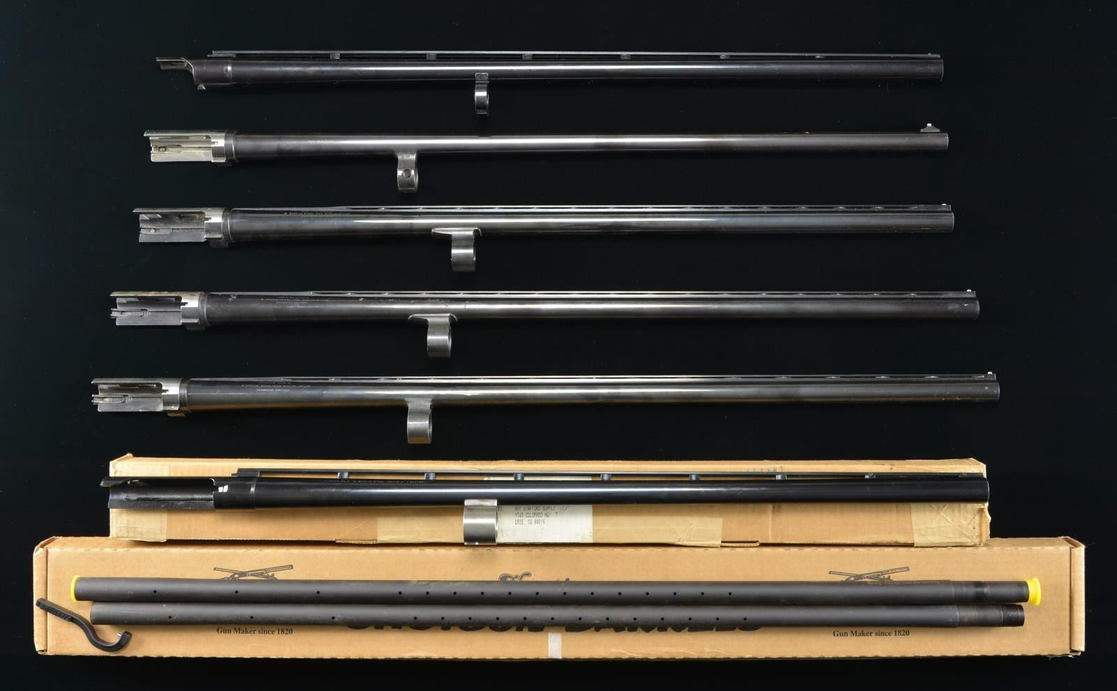 1) Browning Invector Gold 10 Field Barrel. Cal. 10 Ga., 3 1/2". VR 278" bbl. w/ bright bead & full Invector choke. Comes w/ box. CONDITION: near excellent. 2) Japan Browning Auto-5 Magnum Barrel. Cal. 12 Ga., 3". VR 28" bbl. w/ bright bead & full choke. CONDITION: near excellent. 3) Japan Browning Auto-5 Magnum Barrel. Cal. 12 Ga., 3". VR 30" bbl. w/ bright bead & full choke. CONDITION: very good blue w/ several spots of oxidation predominantly w/in 10" from chamber. 4) Belgian Browning Auto-5 Magnum bbl. Cal. 12 Ga., 3". VR 32" bbl. w/ full choke & bright bead. CONDITION: good blue w/ peppery oxidation throughout. 5) Belgian Sweet 16 Bbl. cal. 16 Ga., 2 3/4". Bbl. 28" w/ matted top & island mounted bright bead. Mod choke. CONDITION: very good blue w/ scattered spots of oxidation. Bright shiny bore. 6) Miroku / Browning BPS Field Invector-Plus bbl. Cal. 12 Ga., 2 3/4" & 3". VR 28" bbl. w/ bright bead & Full Invector-Plus choke tube. CONDITION: near excellent blue. Bright shiny bore. 7-8) 2 Hastings Metro barrel extensions 1 for Invector+ barrel & 1 for Benelli Crio barrel. Both come in box. CONDITION: very good finish. (02-19741/MD). $500-1,000.