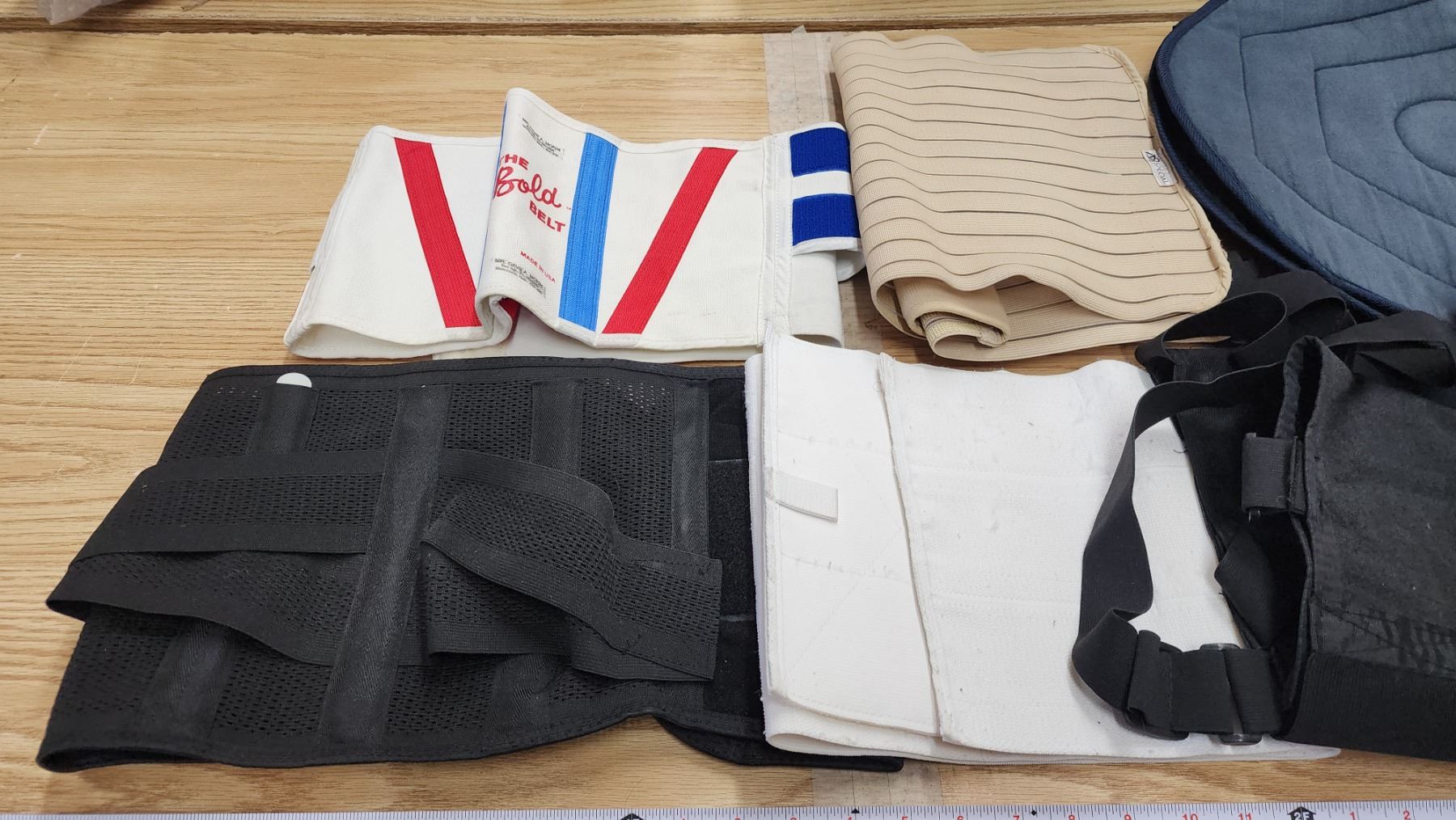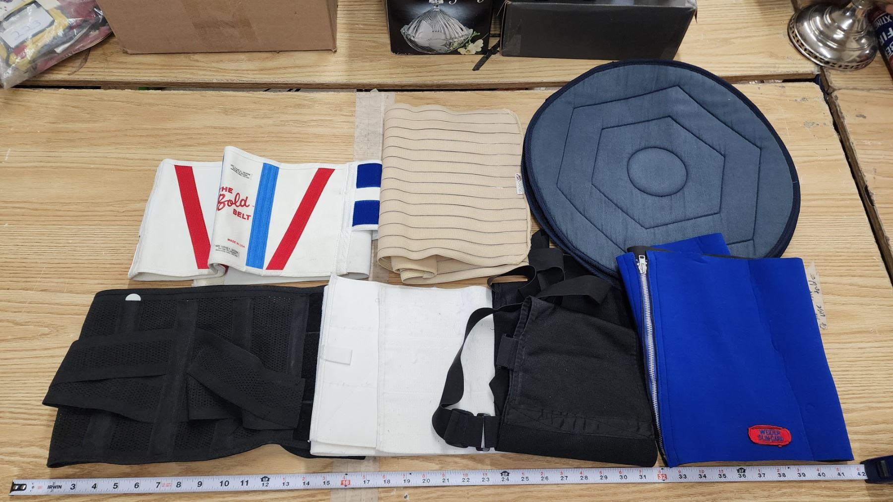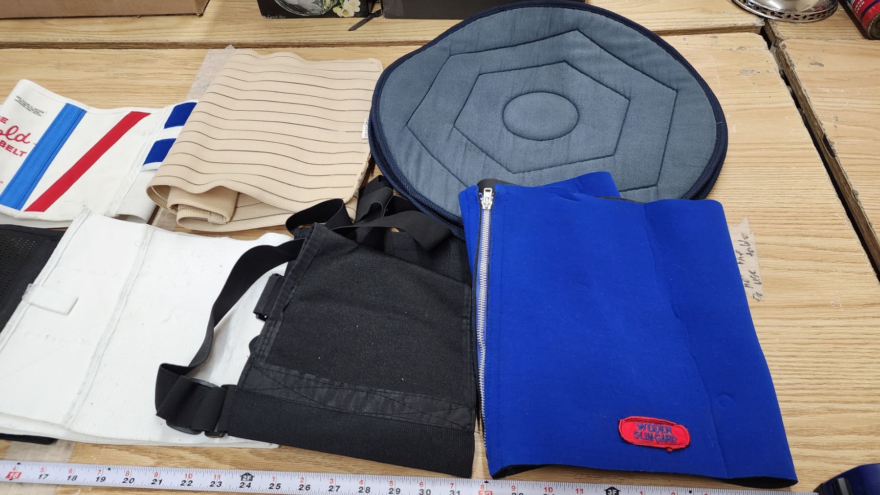 6 Back Braces – assorted sizes + Swivel Car Seat Pad for after hip replacement and cane end