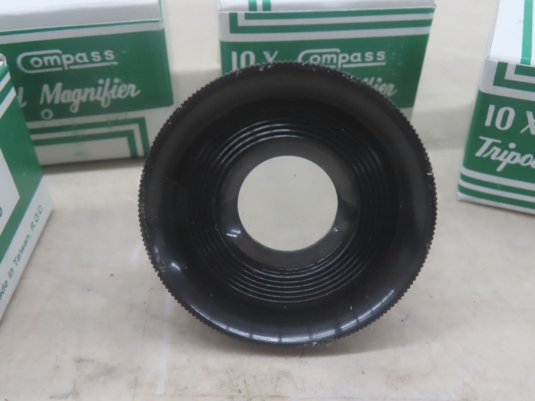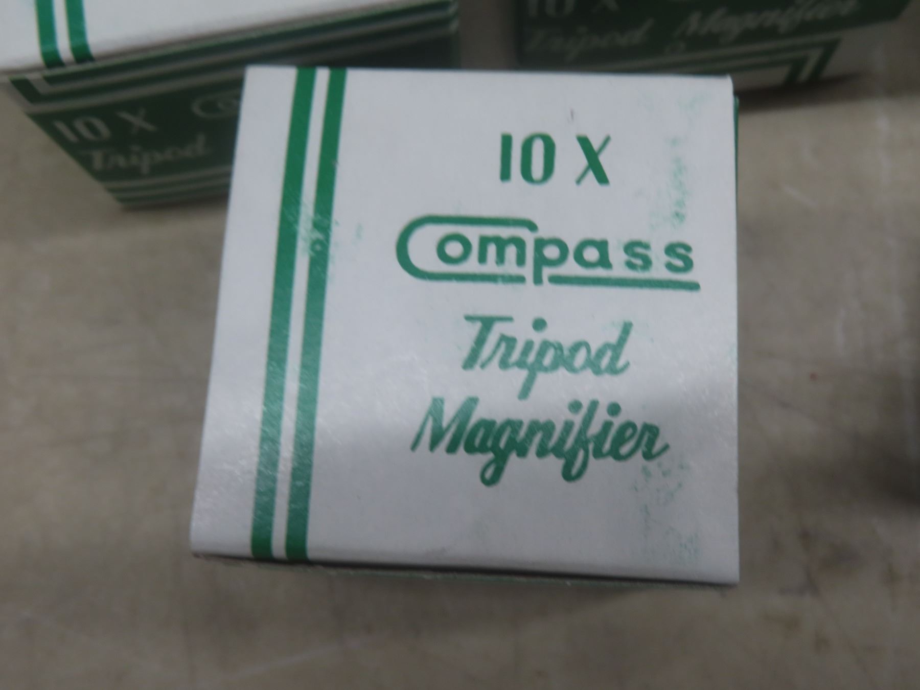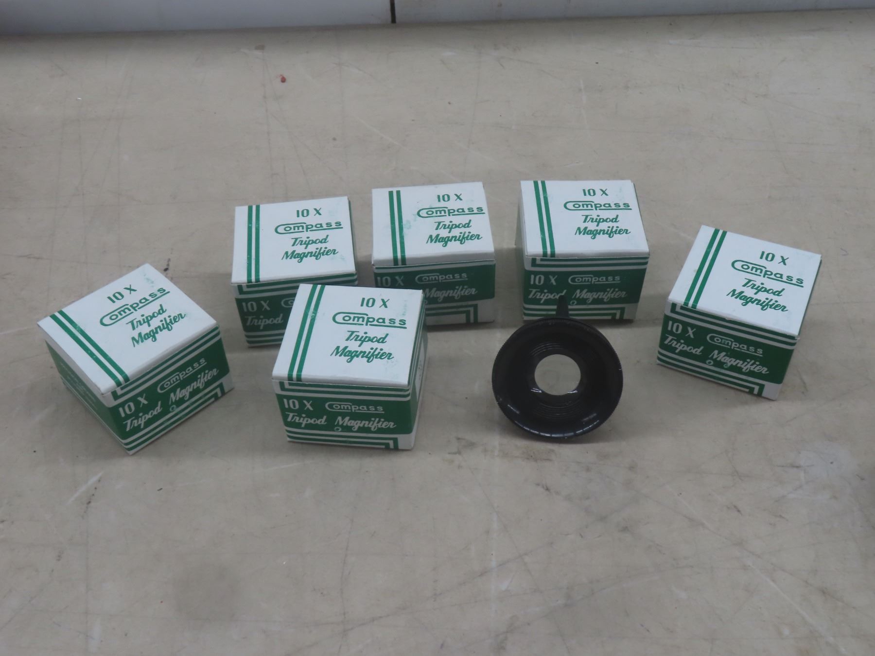 6 Bakelite Compass, 10x Tripod Magnifier, Wood Case, Gillette Razor Box Only, 3 Exit/Open Decals