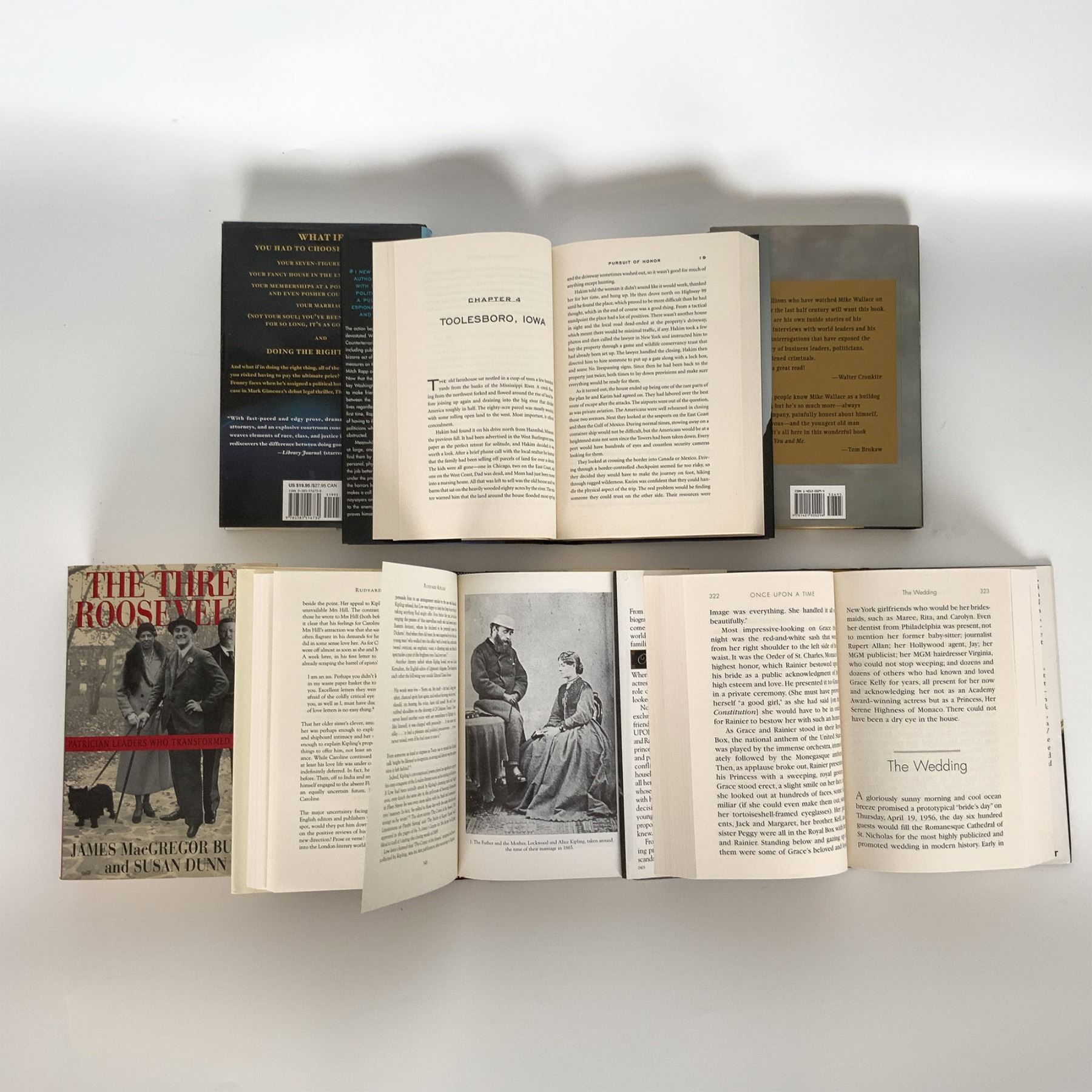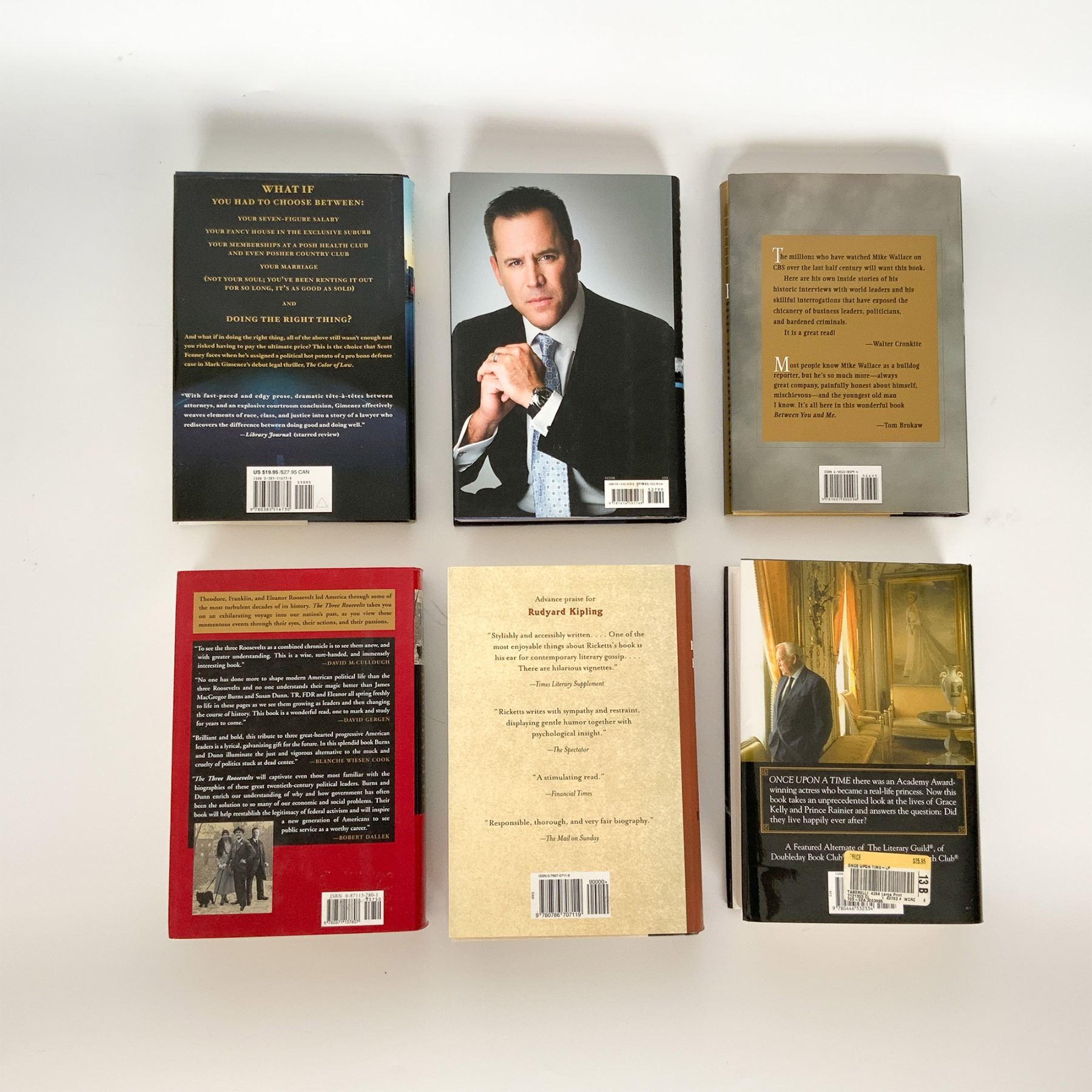 Collection of six hardcover books focusing on historical figures, politics, and personal memoirs. Included are The Color of Law by Mark Gimenez, a legal thriller exploring themes of justice and race; Pursuit of Honor by Vince Flynn, a political thriller centered on counter-terrorism; Between You and Me by Mike Wallace with Gary Paul Gates, a memoir by the famed journalist offering insights into his career and interviews; The Three Roosevelts by James MacGregor Burns and Susan Dunn, an in-depth examination of the Roosevelt family's impact on American history; Once Upon a Time: Behind the Fairy Tale of Princess Grace and Prince Rainier by J. Randy Taraborrelli, a biographical account of Grace Kelly's transformation into royalty; and Rudyard Kipling: A Life by Harry Ricketts, a detailed biography of the celebrated author. A mix of biography, politics, and history, this collection appeals to readers interested in influential figures and historical narratives.