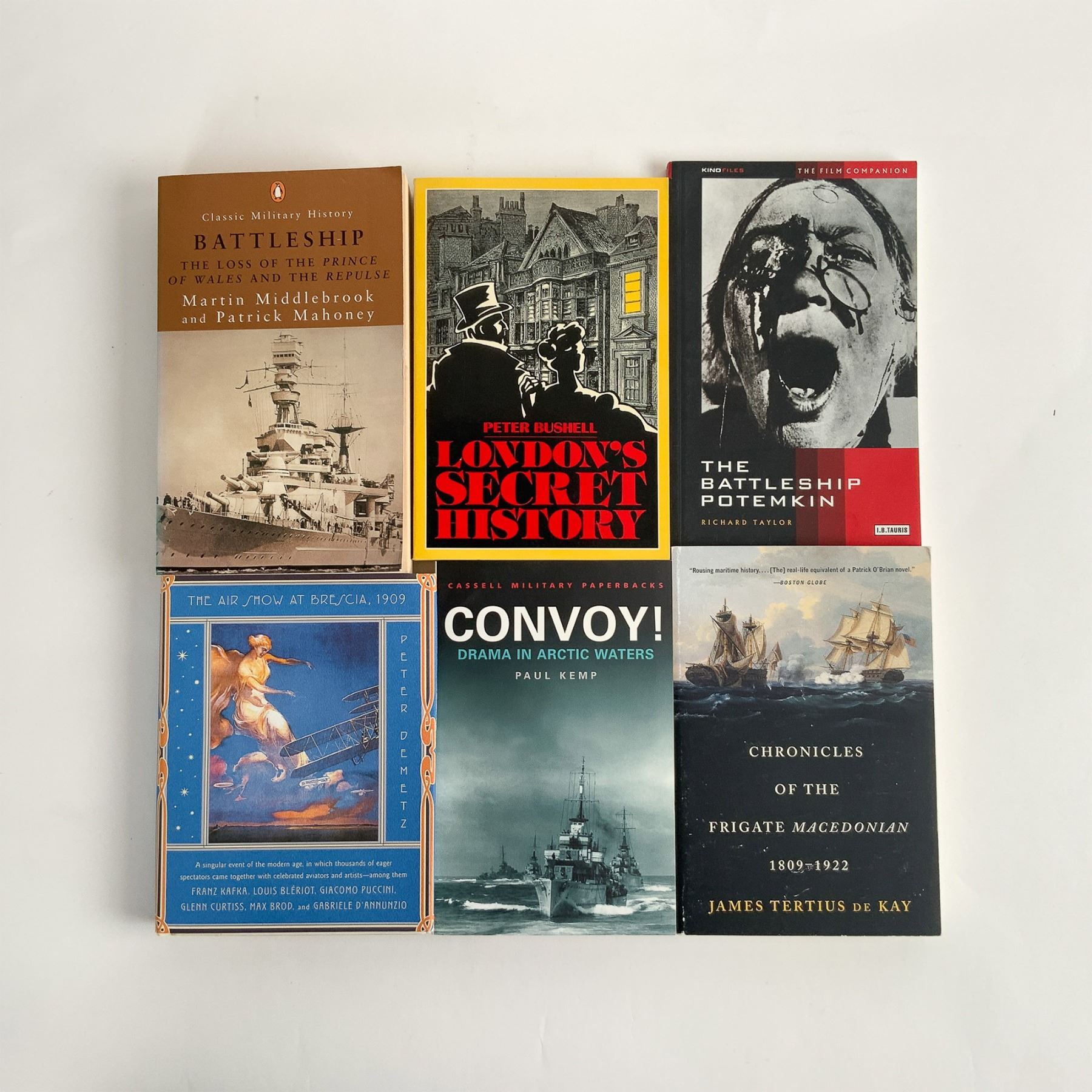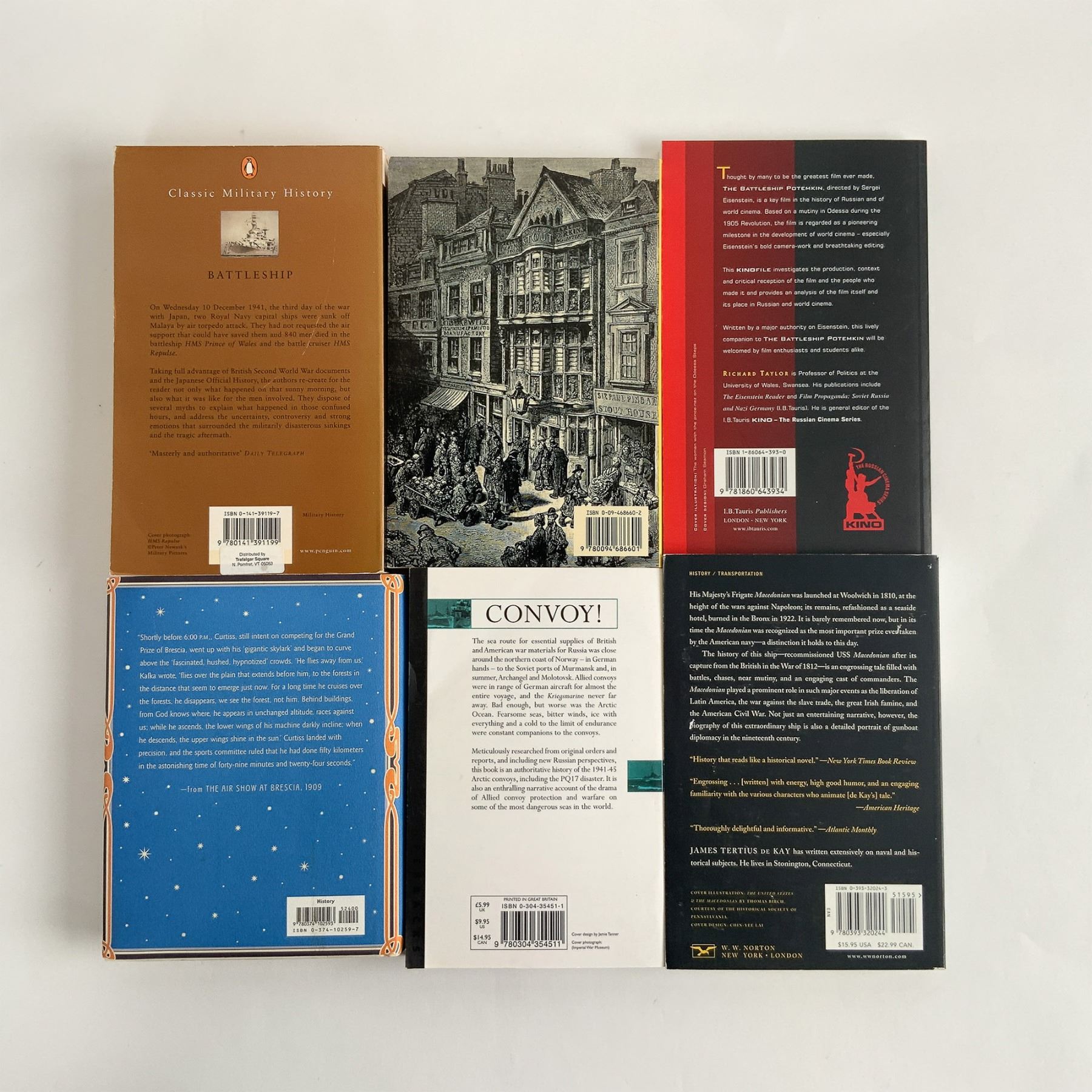 This collection of six books covers pivotal moments in naval and military history, early aviation, and London lesser known past. Battleship: The Loss of the Prince of Wales and the Repulse by Martin Middlebrook and Patrick Mahoney recounts the dramatic events of December 1941, when two of Britain most powerful warships were sunk by Japanese aircraft, marking a turning point in naval warfare. Convoy Drama in Arctic Waters by Paul Kemp examines the harrowing experiences of Allied naval convoys navigating treacherous Arctic routes during World War II, highlighting the strategic importance and human cost of these missions. Chronicles of the Frigate Macedonian from 1809 to 1922 by James Tertius de Kay provides an engrossing history of the HMS Macedonian, a Royal Navy frigate captured by the Americans in the War of 1812, detailing its service under both British and American flags. The Air Show at Brescia 1909 by Peter Demetz explores the spectacular early aviation event in Italy, attended by pioneers like Louis Bleriot, Glenn Curtiss, and even Franz Kafka, capturing the excitement of flight at the dawn of the 20th century. The Battleship Potemkin: The Film Companion by Richard Taylor delves into the revolutionary 1925 Soviet film, analyzing its historical context, cinematic innovations, and political significance. London Secret History by Peter Bushell uncovers hidden stories and lesser known historical events from the city past, revealing the intriguing and often mysterious side of London. Each book is in very good condition, making this set a valuable addition for military history enthusiasts, naval scholars, and collectors of unique historical perspectives. The largest book dimensions: 6.5"L x 2.5"W x 9.5"H.