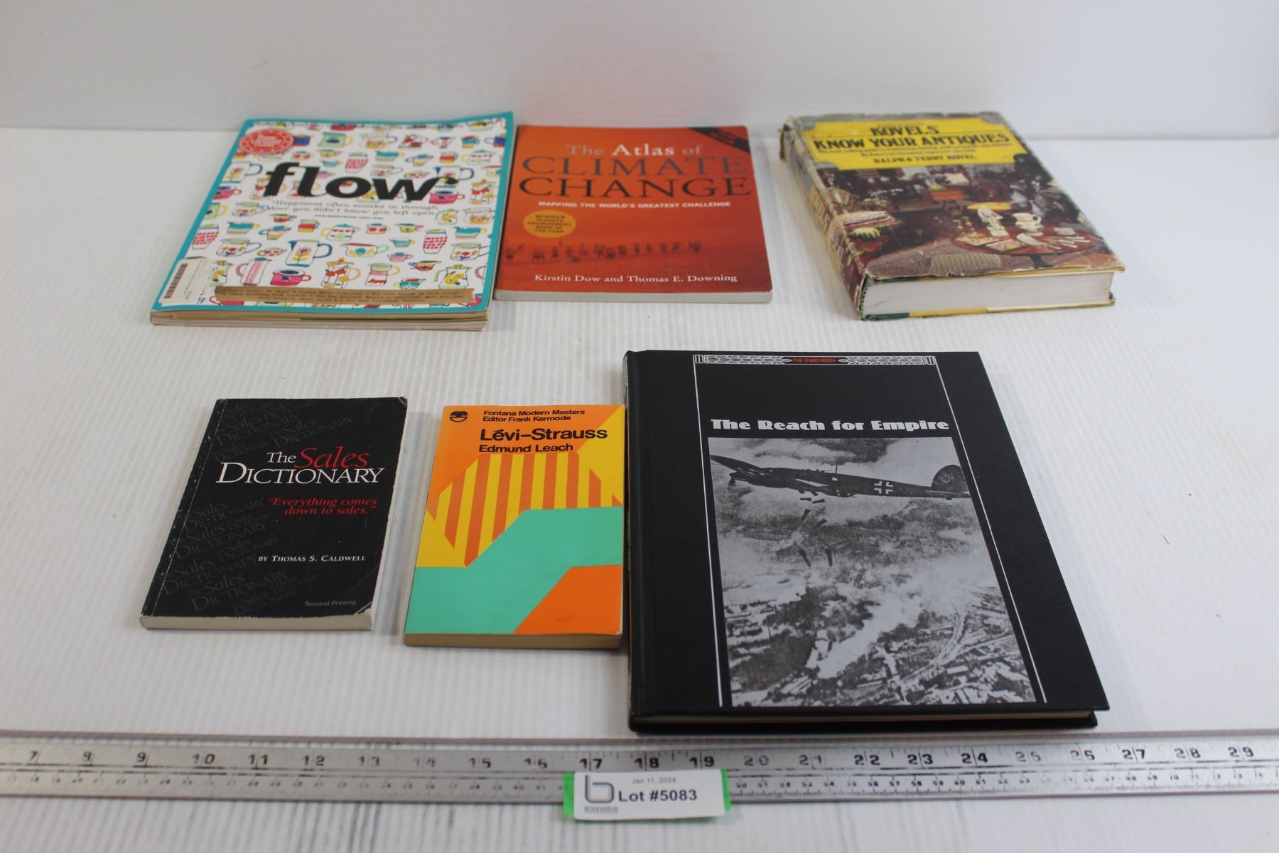 (6) Books - The Sales Dictionary, Kovel's Know Your Antiques, The Atlas of Climate Change