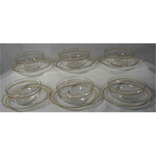 Beautifully etched and gilded. The bowls measure 4.1/2" across the top and stand 1.3/8" high. The underplates/saucers measure 6.3/8" across and stand 1/4" tall. Very fine and delicate glassware that "rings".