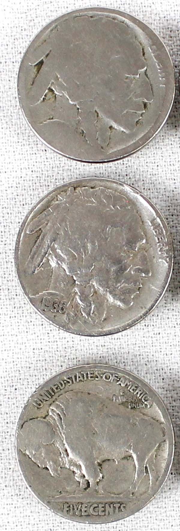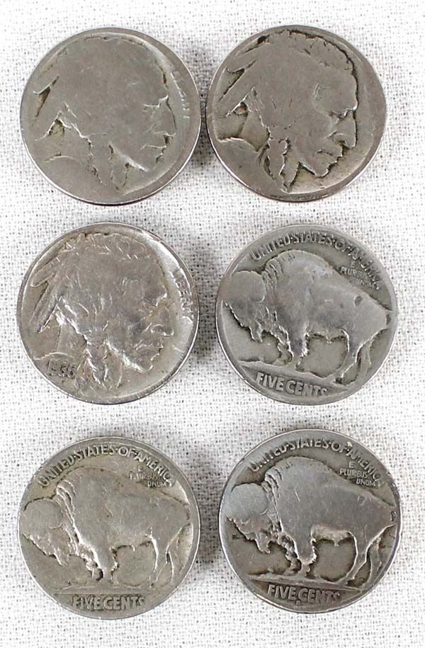 6 Buffalo Nickel Button Covers, measures .75''D, one of the nickels is dated 1936
