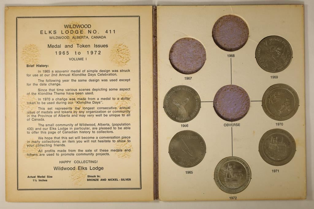 411 ANNUAL KLONDIKE DAYS FOLIO. INCLUDES MEDALS FROM 1965, 1966, 1969, 1970, 1971 AND 1972. EACH MEDAL IS 1 1/2"