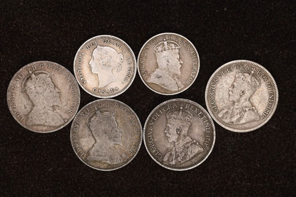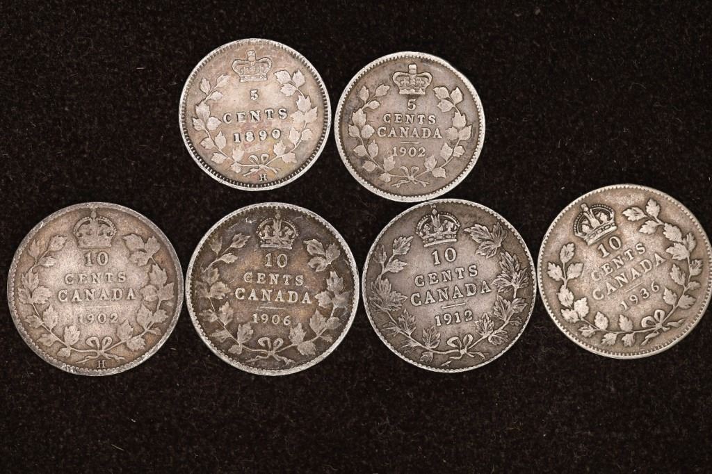 FIVE CENT COINS AND 1902, 1906, 1912 AND 1936 TEN CENT COINS