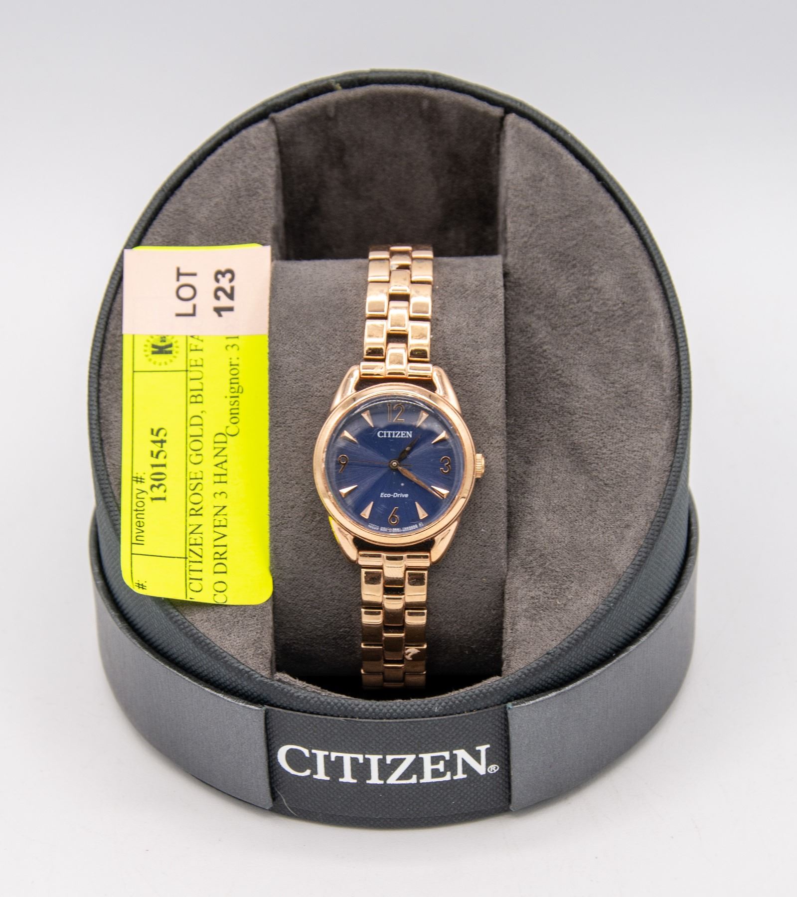 6" CITIZEN ROSE GOLD, BLUE FACE ECO DRIVEN 3 HAND