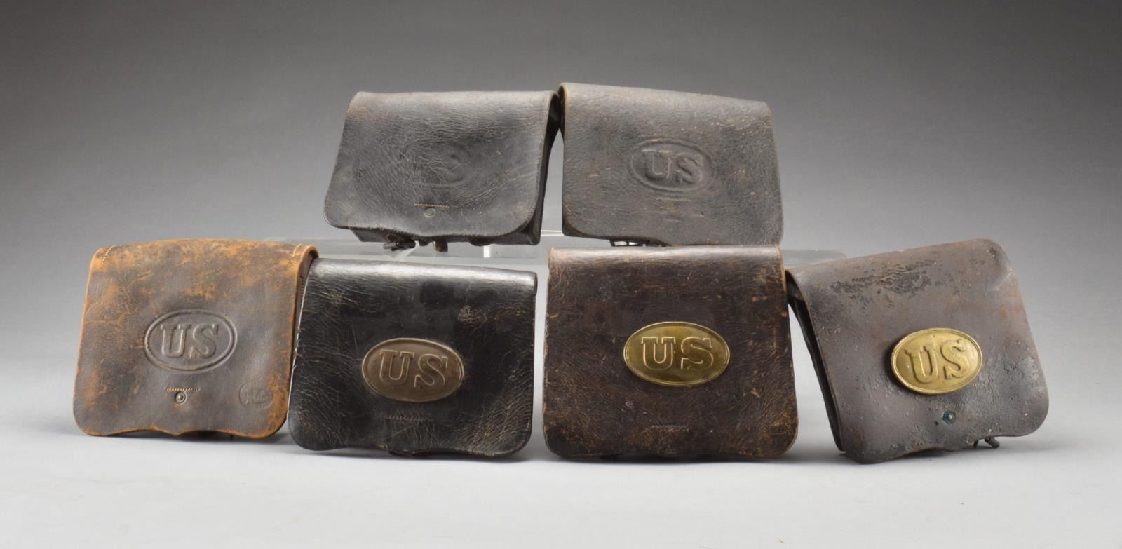 This group includes 3 M1858 cartridge boxes, all having oval “US” buckles on the front flap. 2 Have interior tins, 1 is missing the tins. All have both buckles on the bottom & reasonably solid though flexed tabs on the outer flap. 1 Is made by Gaylord, 1 is unmarked & 1 is made by Hoover Calhoun. / 3 M1864 cartridge boxes, all having embossed “US” in oval on the front flap. 2 Have both buckles on the bottom & solid, though flexed closing tabs. 1 Has a single buckle & a torn closing tab. 2 Have interior tins, 1 is missing the tins. 1 Has an illegible maker’s mark on the outer flap. CONDITION: all boxes show moderate to heavy use but are in solid condition except as noted. (02-14278-1/BF). $1,200-1,500.