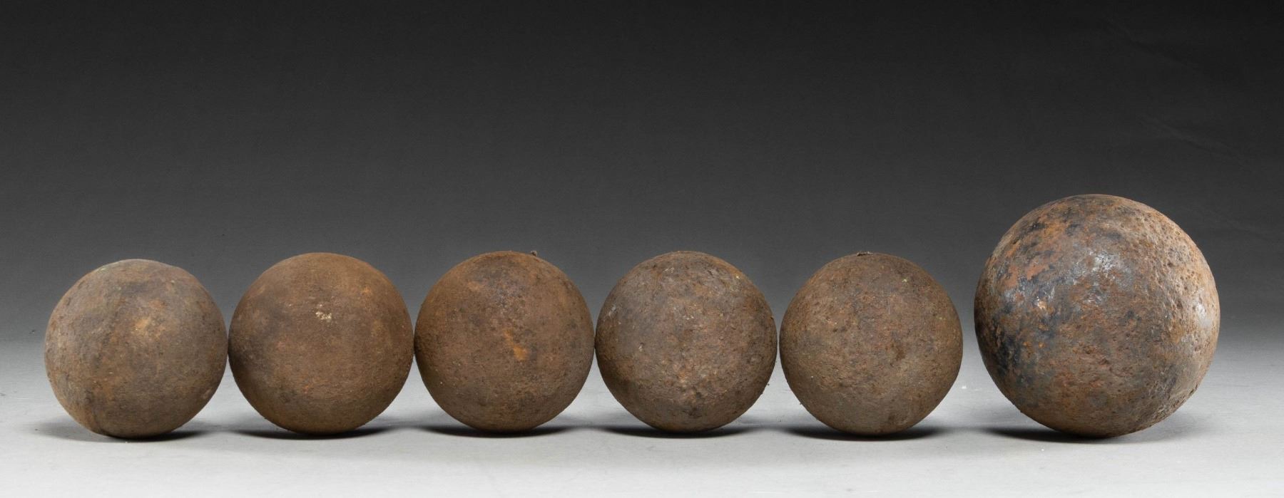1) 1 ball weighting approx. 8lb. being approx. 3.89" in diameter. 2-6) 5 approx. 3" diameter balls used in stand of grape for 32 pound gun. CONDITION: balls appear intact within oxidation & pitting throughout. (02-24526-14/MD). NON-GUN. $300-500.