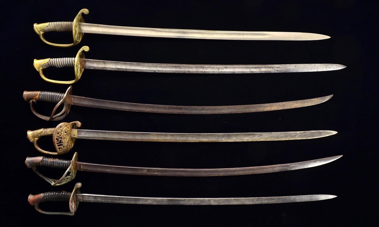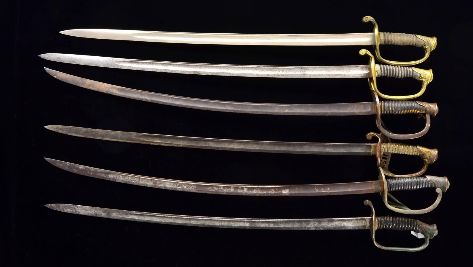 1) NONREGULATION CAVALRY OFFICER. Overall length: 38". Blade length: 32". Single fullered blade marked at the ricasso, “HENRY BOKER SOLINGEN”. Gilded brass branched hilt. Wire wrapped leather grip. No scabbard. CONDITION: blade has a dark patina. Hilt is loose & shows only traces of original gilding. Grip is 85% but only traces of wire remain. 2) M1850 STAFF & FIELD. Overall length: 37 3/4". Blade length: 32". Single fullered etched blade w/ no visible maker marks. Gilded brass hilt. Wire wrapped sharkskin grip. No scabbard. CONDITION: blade has a dark patina & has been sharpened. Hilt is loose, bent & has been painted gold. Grip covering & wire are nearly completely gone. Wood core is 60%. 3) M1850 FOOT OFFICER. Overall length: 36". Blade length: 30 1/4". Single fullered, foreign made, etched blade. Gilded brass hilt. Wire wrapped sharkskin grip. No scabbard. CONDITION: blade is well worn. Hilt retains no gilding. Grip is about 95%. No wire remains. 4) M1850 FOOT OFFICER. Overall length: 37 1/2". Blade length: 31 3/4". Single fullered etched blade of French mfg. Gilded brass hilt. Wire wrapped sharkskin grip. No scabbard. CONDITION: blade has a medium gray patina w/ sharp engraving. Hilt retains traces of original gilding. Grip & wire are complete. 5) M1850 FOOT OFFICER. Overall length: 37 1/2". Blade length: 31 1/2". Single fullered, foreign made, etched blade. Gilded brass hilt. Wire wrapped leather grip. No scabbard. CONDITION: blade has a dark patina. Hilt retains no gilding. Grip is about 95%. Wire is about 70%. 6) CAVALRY OFFICER. Overall length: 37 1/4". Blade length: 31 1/2". Single fullered blade marked at the ricasso, “HORSTMANN & SONS”. Brass branched hilt. Wire wrapped leather grip. No scabbard. CONDITION: blade has a very dark oxidized patina. Hilt is loose. Grip is about 75%. No wire remains. (02-14355/BF). $1,000-1,400.
