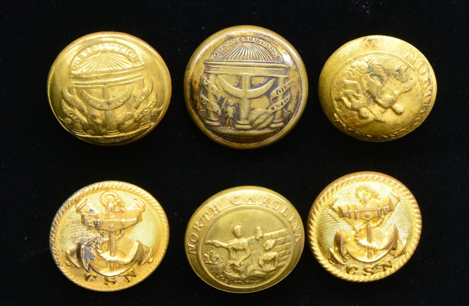 4) NORTH CAROLINA. A very fine example of a locally mfg. North Carolina button utilized by Confederate militia forces. Albert # NC-8-A. Face depicts the State Seal of North Carolina & the reverse is marked, RMDC “S.A.MYERS RICHMOND VA. “. Full straight shank. CONDITION: button has a mellow brass patina w/ traces of original gilded finish.