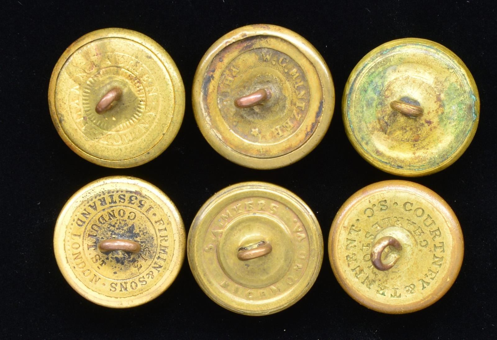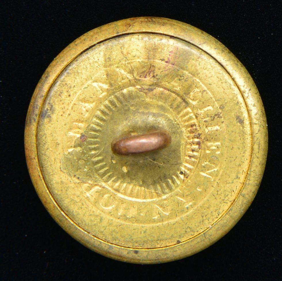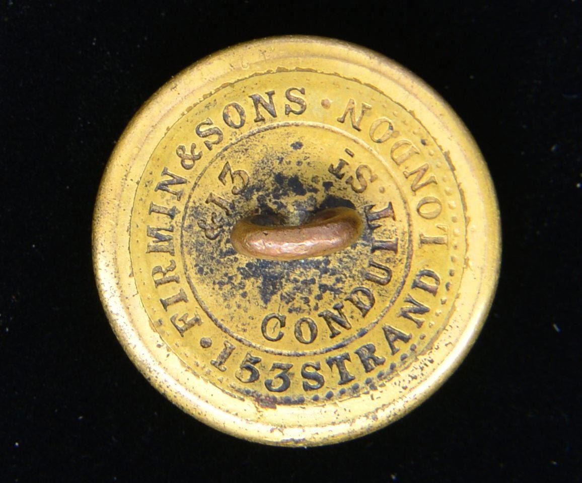 1) NAVY. A nice example of a Civil War period Confederate Naval Officer’s button. This button was mfg. in England & imported through blockade runners to the Confederacy. Albert # CS-52-A. Face depicts crossed cannons superimposed by a fouled anchor w/ “CSN” below. The reverse is marked, “FIRMIN & SONS .153 STRAND LONDON. &13 CONDUIT.ST “. Full shank is slightly bent. CONDITION: button retains most of its original gilded finish.