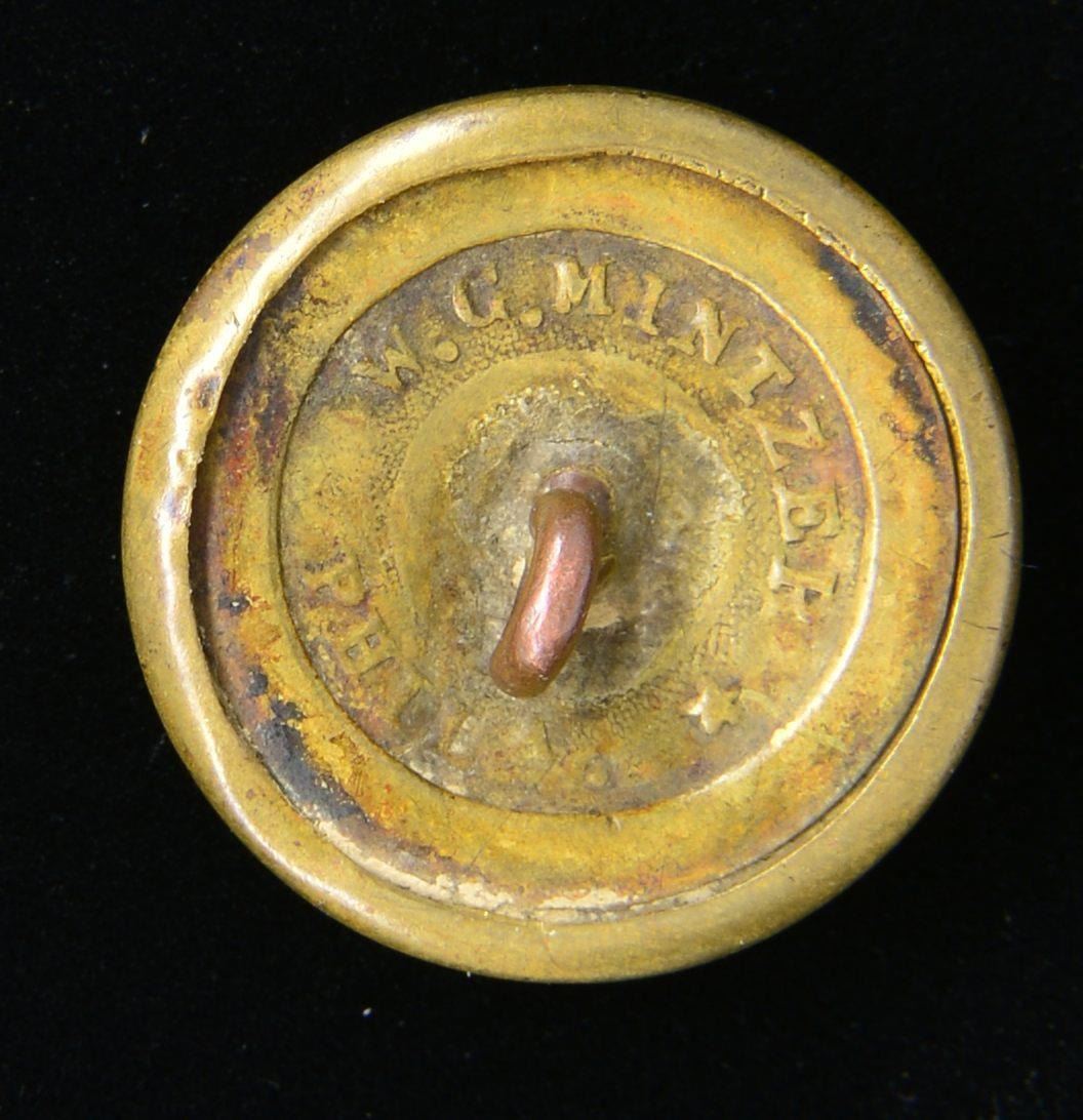 6) GEORGIA. A rare example of a pre Civil War mfg. Georgia militia button utilized by Confederate forces. Albert # GA-3-A. Face depicts the State Seal of Georgia. The reverse is marked, RMDC “W.G.MINTZER (star) PHILA. “. Full slightly bent shank. CONDITION: button has a mellow brass patina & is slightly pushed in the back. (02-16927-13/BF). $2,800-3,500.