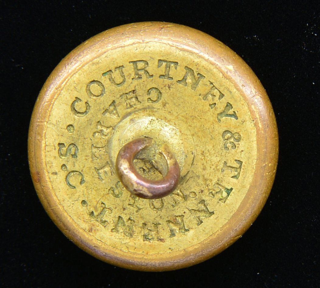 2) NAVY. A nice example of a Civil War period Confederate Naval Officer’s button. This button was mfg. in England & imported through blockade runners to the Confederacy. Albert # CS-54-A. Face depicts crossed cannons superimposed by a fouled anchor w/ “CSN” below. The reverse is marked, “COURTNEY & TENNENT . S.C . CHARLESTON.”. Full shank is slightly bent. CONDITION: button retains most of its original gilded finish.