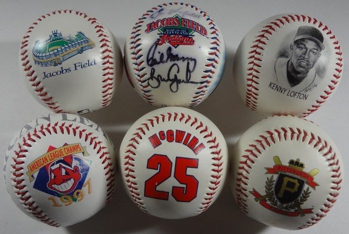 4-CLEVELAND INDIANS COMMEMORATIVE BASEBALLS (one with few unidentified autos), 1 CARDINALS, 1 PIRATES, EST $30-$40