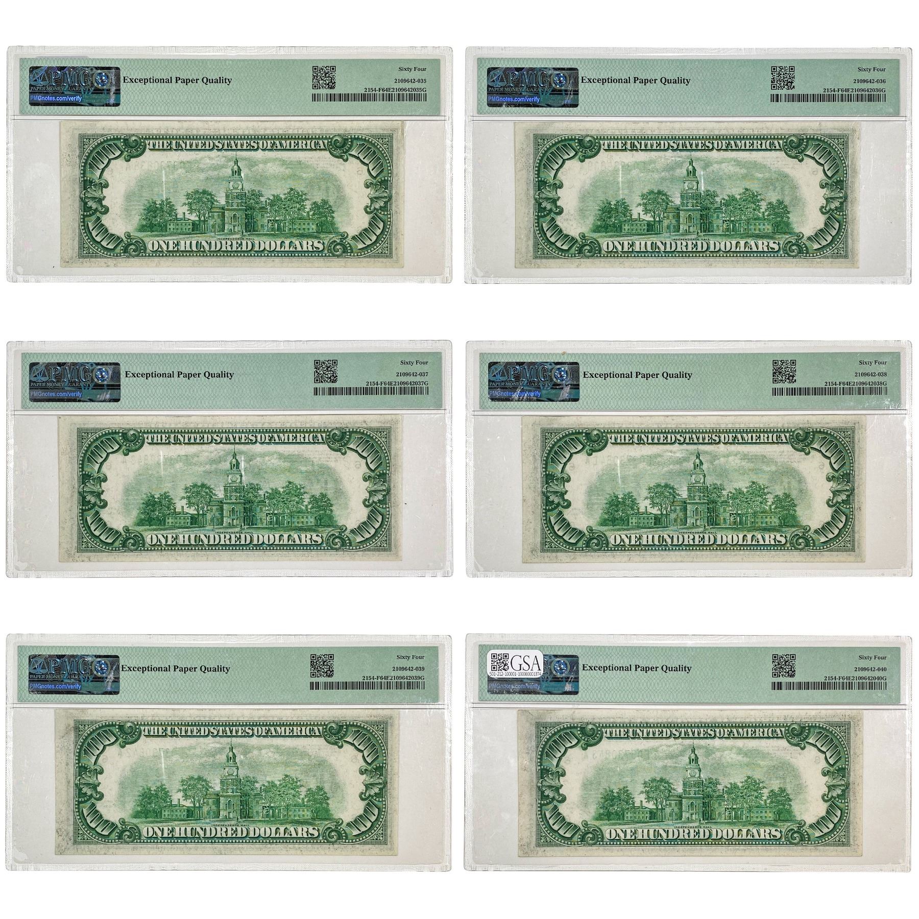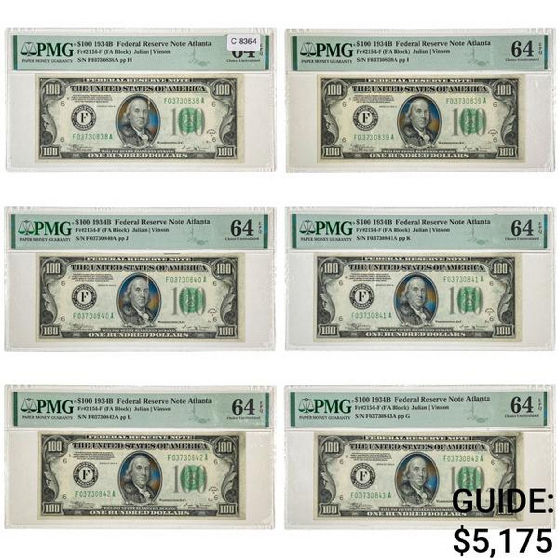 (6) CONS. 1934-B $100 FRN'S PMG UNC-64EPQ