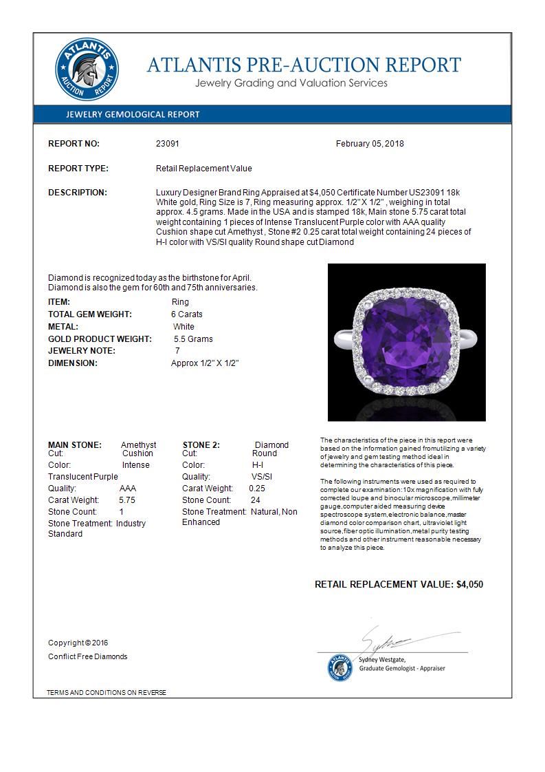 REF-56A8X -23091 ---- 6 CTW Amethyst & Micro Pave Halo VS/SI Diamond Ring Solitaire 18K White Gold ---- Luxury Designer Brand Ring Appraised at $4,050 Certificate Number US23091 18k White gold, Ring Size is 7, Ring measuring approx. 1/2" X 1/2" , weighing in total approx. 4.5 grams. Made in the USA and is stamped 18k, Main stone 5.75 carat total weight containing 1 pieces of Intense Translucent Purple color with AAA quality Cushion shape cut Amethyst , Stone #2 0.25 carat total weight containing 24 pieces of H-I color with VS/SI quality Round shape cut Diamond