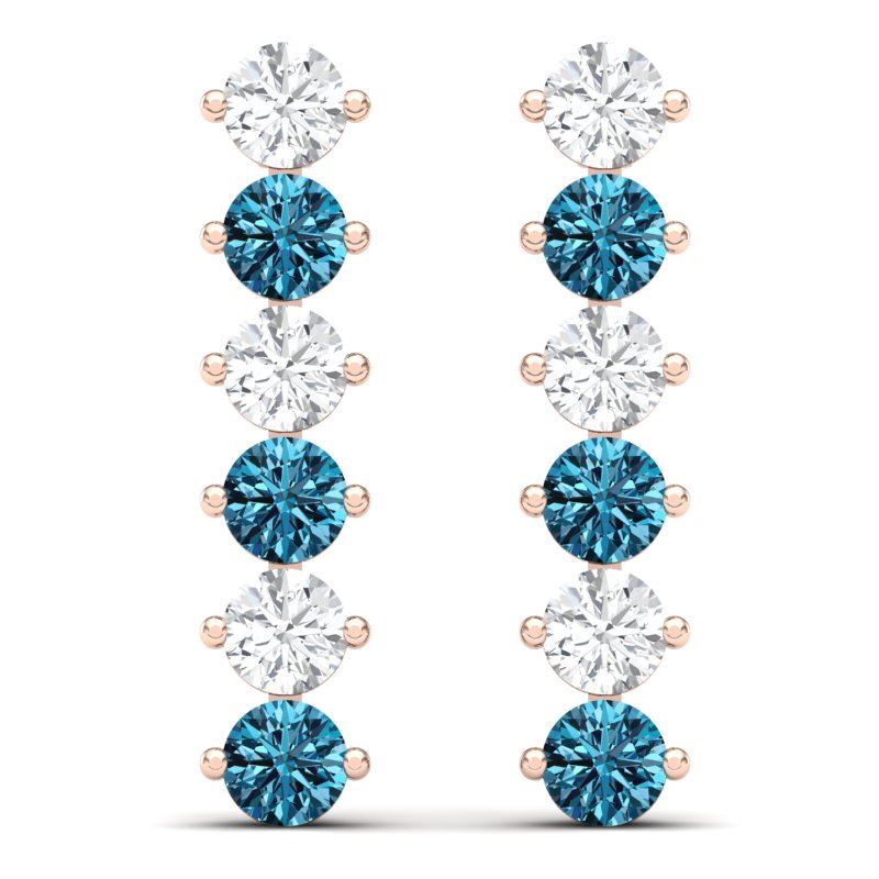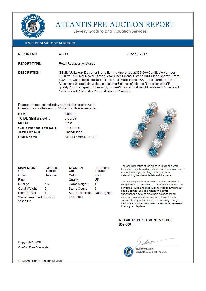 6 CTW Certified Si/I Fancy Blue & White Diamond Earrings 18K Rose Gold ---- Luxury Designer Brand Earring Appraised Retail Price at $39,600 ---- SKU Number US40213 18K Rose gold Earring Size is Inches long, Earring measuring approx. 7 mm x 32 mm, weighing in total approx. 9 grams. Made in the USA and is stamped 18K, Main stone 3 carat total weight containing 6 pieces of Intense Blue color with SI/I quality Round shape cut Diamond , Stone #2 3 carat total weight containing 6 pieces of G-H color with SI/I quality Round shape cut