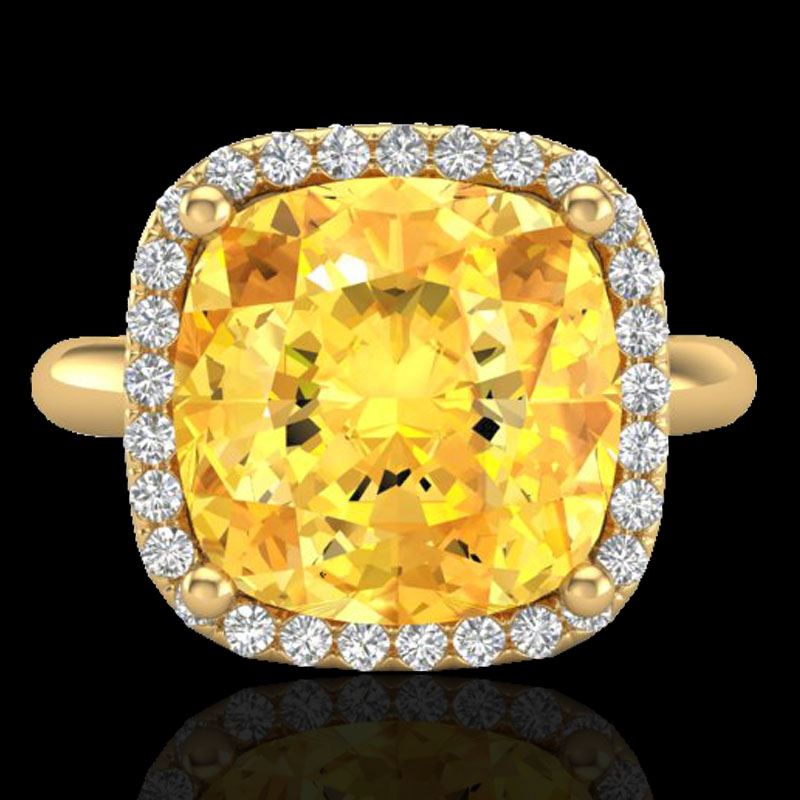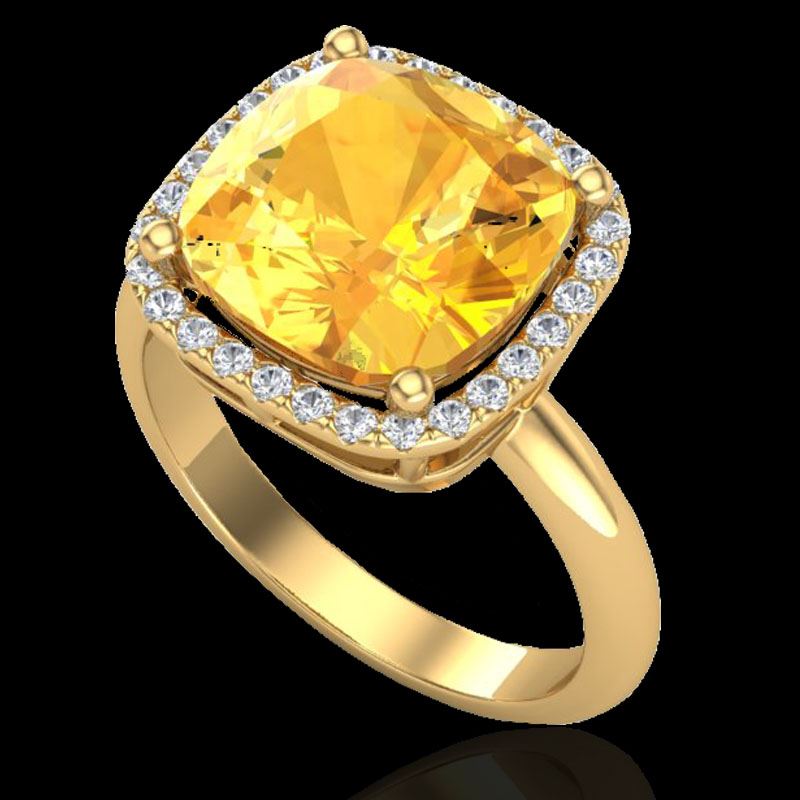 REF-58W2F -23096 ---- 6 CTW Citrine And Micro Pave Halo VS/SI Diamond Ring Solitaire 18K Yellow Gold ---- Luxury Designer Brand Ring Appraised at $3,850 Certificate Number US23096 18k Yellow gold, Ring Size is 7, Ring measuring approx. 1/2" X 1/2" , weighing in total approx. 4.5 grams. Made in the USA and is stamped 18k, Main stone 5.75 carat total weight containing 1 pieces of Translucent Yellow color with AAA quality Cushion shape cut Citrine , Stone #2 0.25 carat total weight containing 24 pieces of H-I color with VS/SI quality Round shape cut Diamond
