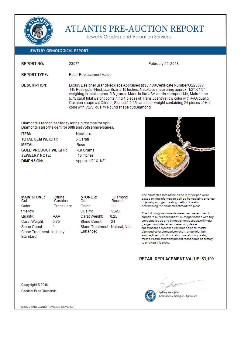 REF-50W9F -23077 ---- 6 CTW Citrine & Micro Pave Halo VS/SI Diamond Necklace Solitaire 14K Rose Gold ---- Luxury Designer Brand Necklace Appraised at $3,100 Certificate Number US23077 14k Rose gold, Necklace Size is 16 Inches, Necklace measuring approx. 1/2" X 1/2" , weighing in total approx. 3.8 grams. Made in the USA and is stamped 14k, Main stone 5.75 carat total weight containing 1 pieces of Translucent Yellow color with AAA quality Cushion shape cut Citrine , Stone #2 0.25 carat total weight containing 24 pieces of H-I color with VS/SI quality Round shape cut Diamond