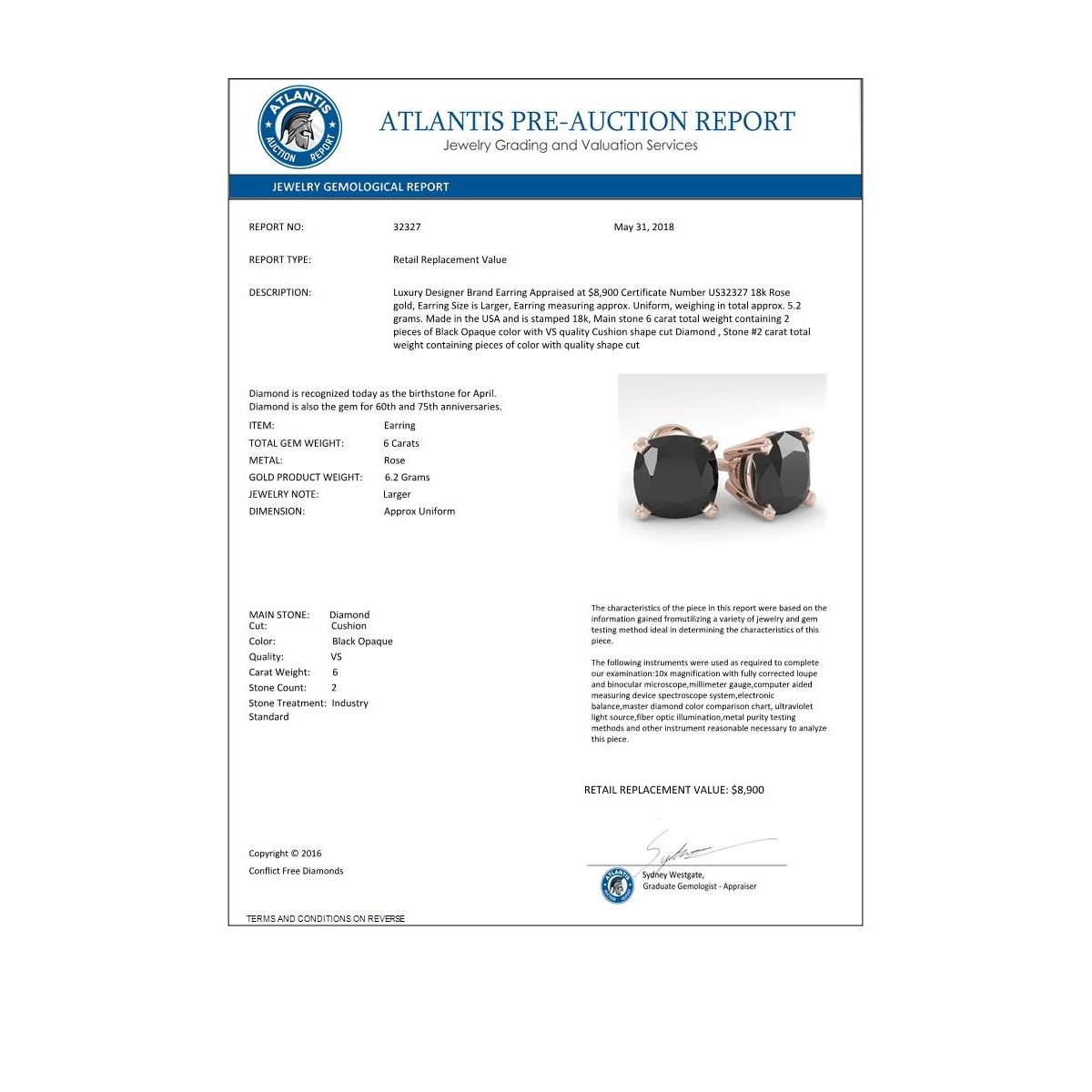 REF-146W9F -32327 ---- 6 CTW Cushion Black Diamond Stud Designer Earrings 18K Rose Gold ---- Luxury Designer Brand Earring Appraised at $8,900 Certificate Number US32327 18k Rose gold, Earring Size is Larger, Earring measuring approx. Uniform, weighing in total approx. 5.2 grams. Made in the USA and is stamped 18k, Main stone 6 carat total weight containing 2 pieces of Black Opaque color with VS quality Cushion shape cut Diamond , Stone #2 carat total weight containing pieces of color with quality shape cut