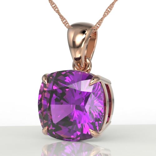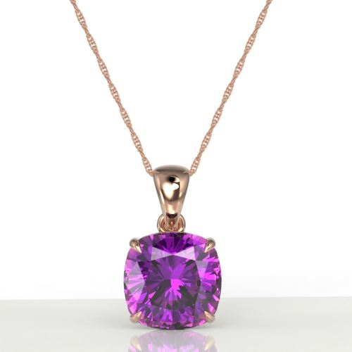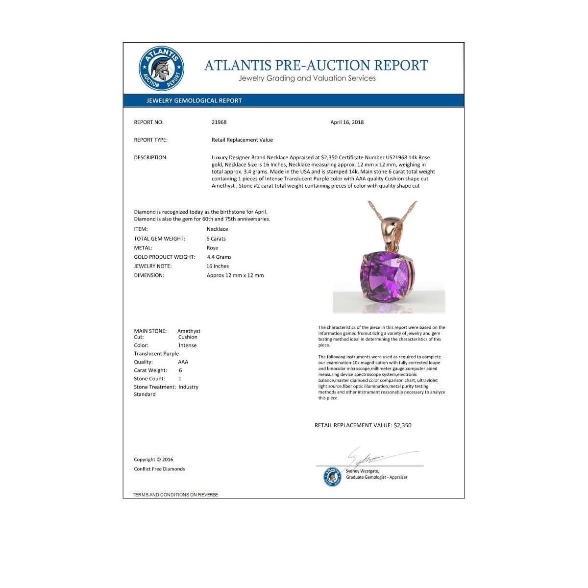 REF-35M3H -21968 ---- 6 CTW Cushion Cut Amethyst Designer Solitaire Necklace 14K Rose Gold ---- Luxury Designer Brand Necklace Appraised at $2,350 Certificate Number US21968 14k Rose gold, Necklace Size is 16 Inches, Necklace measuring approx. 12 mm x 12 mm, weighing in total approx. 3.4 grams. Made in the USA and is stamped 14k, Main stone 6 carat total weight containing 1 pieces of Intense Translucent Purple color with AAA quality Cushion shape cut Amethyst , Stone #2 carat total weight containing pieces of color with quality shape cut