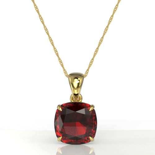 REF-34M5H -21984 ---- 6 CTW Cushion Cut garnet Designer Solitaire necklace 18K Yellow Gold ---- Luxury Designer Brand Necklace Appraised at $2,100 Certificate Number US21984 18k Yellow gold, Necklace Size is 16 Inches, Necklace measuring approx. 12 mm x 12 mm, weighing in total approx. 3.4 grams. Made in the USA and is stamped 18k, Main stone 6 carat total weight containing 1 pieces of Saturated purplish Red color with AAA quality Cushion shape cut Garnet , Stone #2 carat total weight containing pieces of color with quality shape cut