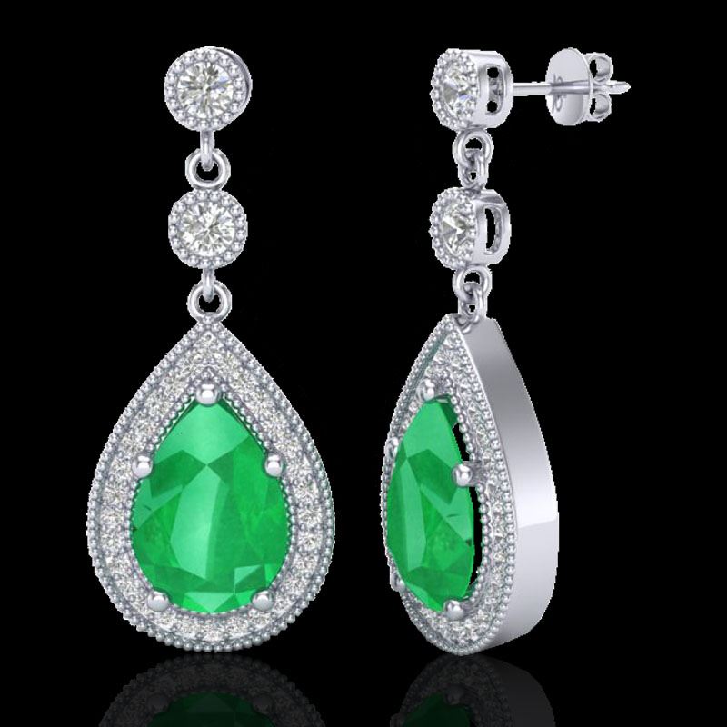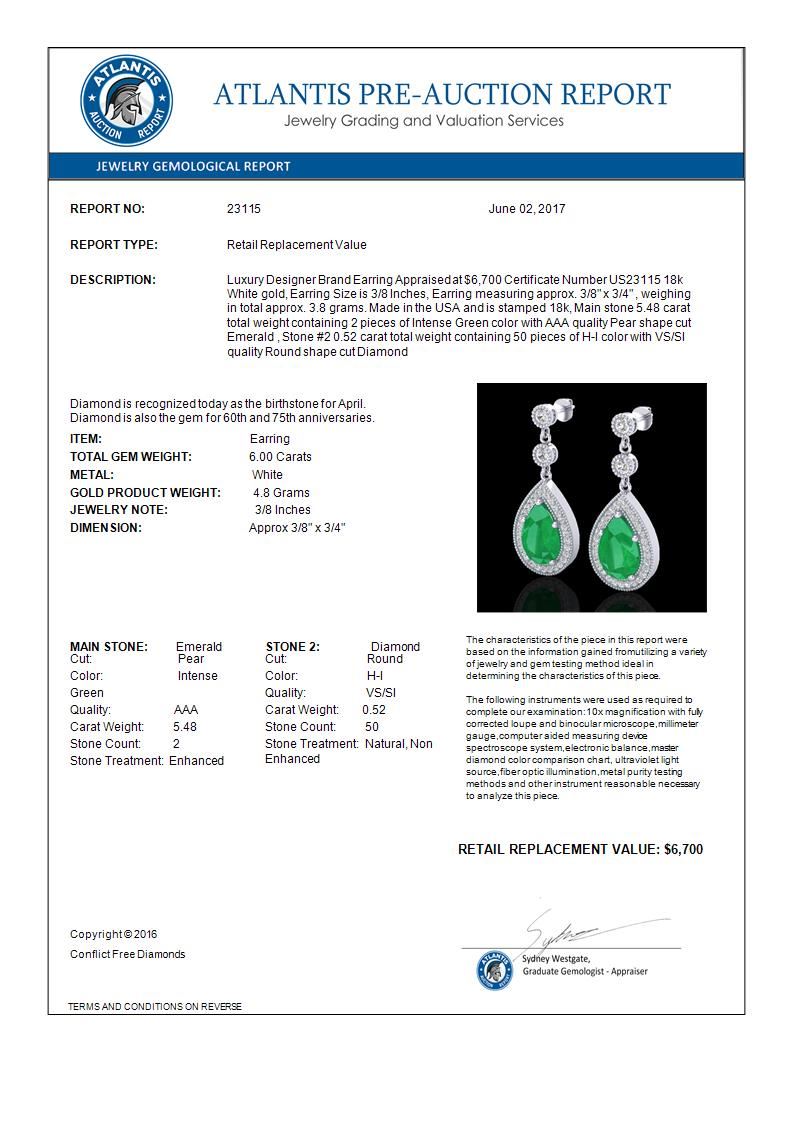 6 CTW Emerald & Micro Pave VS/SI Diamond Earrings Designer 18K White Gold ---- Luxury Designer Brand Earring Appraised Retail Price at $6,700 ---- SKU Number US23115 18k White gold Earring Size is 3/8 Inches, Earring measuring approx. 3/8" x 3/4" , weighing in total approx. 3.8 grams. Made in the USA and is stamped 18k, Main stone 5.48 carat total weight containing 2 pieces of Intense Green color with AAA quality Pear shape cut Emerald , Stone #2 0.52 carat total weight containing 50 pieces of H-I color with VS/SI quality Round shape cut