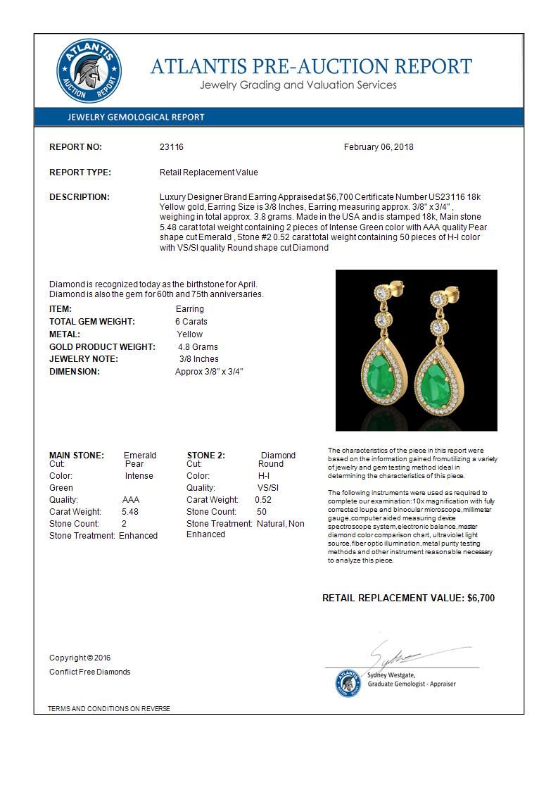 REF-93X8T -23116 ---- 6 CTW Emerald & Micro Pave VS/SI Diamond Earrings Designer 18K Yellow Gold ---- Luxury Designer Brand Earring Appraised at $6,700 Certificate Number US23116 18k Yellow gold, Earring Size is 3/8 Inches, Earring measuring approx. 3/8" x 3/4" , weighing in total approx. 3.8 grams. Made in the USA and is stamped 18k, Main stone 5.48 carat total weight containing 2 pieces of Intense Green color with AAA quality Pear shape cut Emerald , Stone #2 0.52 carat total weight containing 50 pieces of H-I color with VS/SI quality Round shape cut Diamond