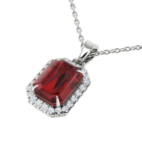 REF-50W9F -21361 ---- 6 CTW Garnet And Micro Pave VS/SI Diamond Halo Necklace 18K White Gold ---- Luxury Designer Brand Necklace Appraised at $3,350 Certificate Number US21361 18k White gold, Necklace Size is 16 Inches, Necklace measuring approx. 1/2" X 1/2" , weighing in total approx. 3.8 grams. Made in the USA and is stamped 18k, Main stone 5.8 carat total weight containing 1 pieces of Saturated purplish Red color with AAA quality Emerald shape cut Garnet , Stone #2 0.2 carat total weight containing 25 pieces of H-I color with VS/SI quality Round shape cut Diamond