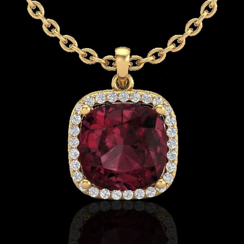6 CTW Garnet & Micro Pave Halo VS/SI Diamond Necklace Solitaire 18K Yellow Gold ---- Luxury Designer Brand Necklace Appraised Retail Price at $3,550 ---- SKU Number US23083 18k Yellow gold Necklace Size is 16 Inches, Necklace measuring approx. 1/2" X 1/2" , weighing in total approx. 3.8 grams. Made in the USA and is stamped 18k, Main stone 5.75 carat total weight containing 1 pieces of Saturated purplish Red color with AAA quality Cushion shape cut Garnet , Stone #2 0.25 carat total weight containing 24 pieces of H-I color with VS/SI quality Round shape cut