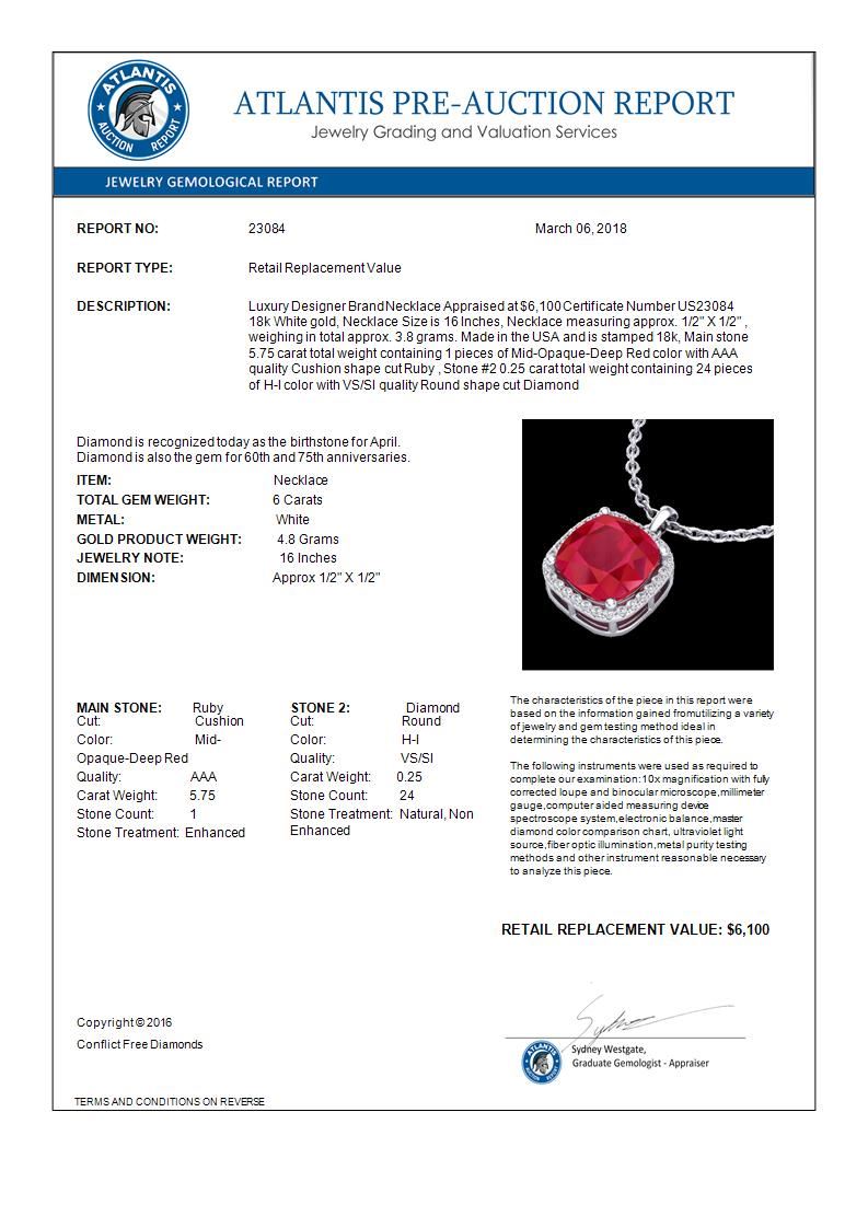 REF-85K5W -23084 ---- 6 CTW Ruby & Micro Pave Halo VS/SI Diamond Necklace Solitaire 18K White Gold ---- Luxury Designer Brand Necklace Appraised at $6,100 Certificate Number US23084 18k White gold, Necklace Size is 16 Inches, Necklace measuring approx. 1/2" X 1/2" , weighing in total approx. 3.8 grams. Made in the USA and is stamped 18k, Main stone 5.75 carat total weight containing 1 pieces of Mid-Opaque-Deep Red color with AAA quality Cushion shape cut Ruby , Stone #2 0.25 carat total weight containing 24 pieces of H-I color with VS/SI quality Round shape cut Diamond