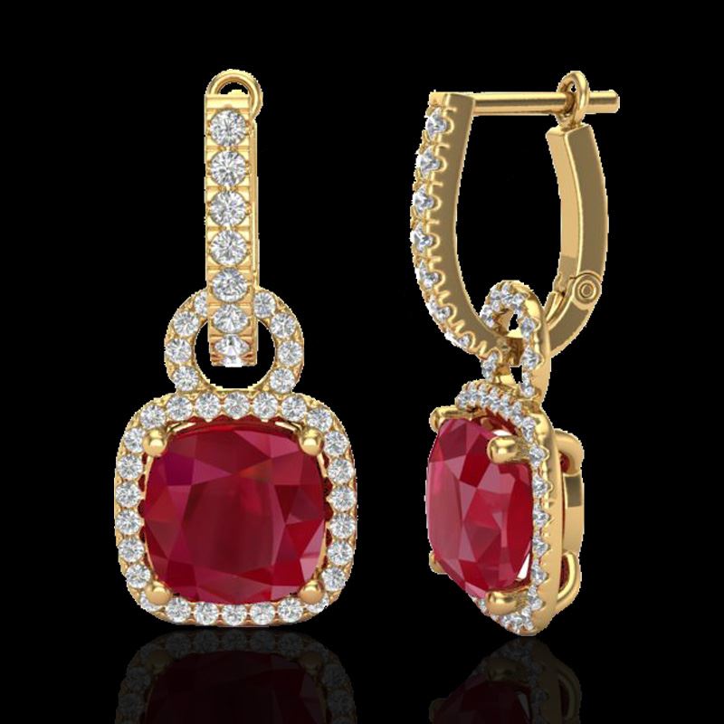 6 CTW Ruby & Micro Pave VS/SI Diamond Certified Earrings 18K Yellow Gold ---- Luxury Designer Brand Earring Appraised Retail Price at $9,150 ---- SKU Number US22969 18k Yellow gold Earring Size is 1 Inches, Earring measuring approx. 1" X 7/16" , weighing in total approx. 5.8 grams. Made in the USA and is stamped 18k, Main stone 5.25 carat total weight containing 2 pieces of Mid-Opaque-Deep Red color with AAA quality Cushion shape cut Ruby , Stone #2 0.75 carat total weight containing 84 pieces of H-I color with VS/SI quality Round shape cut