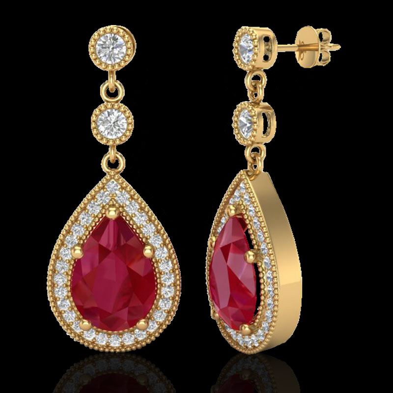 REF-93H8A -23121 ---- 6 CTW Ruby & Micro Pave VS/SI Diamond Earrings Designer 18K Yellow Gold ---- Luxury Designer Brand Earring Appraised at $7,200 Certificate Number US23121  18k Yellow gold,  Earring Size is 3/8 Inches, Earring measuring approx. 3/8" x 3/4"  , weighing in total approx. 3.8 grams. Made in the USA and is stamped 18k, Main stone 5.48 carat total weight containing 2 pieces of Mid-Opaque-Deep Red color with AAA quality Pear shape cut Ruby , Stone #2 0.52 carat total weight containing 50 pieces of H-I color with  VS/SI quality Round shape cut Diamond