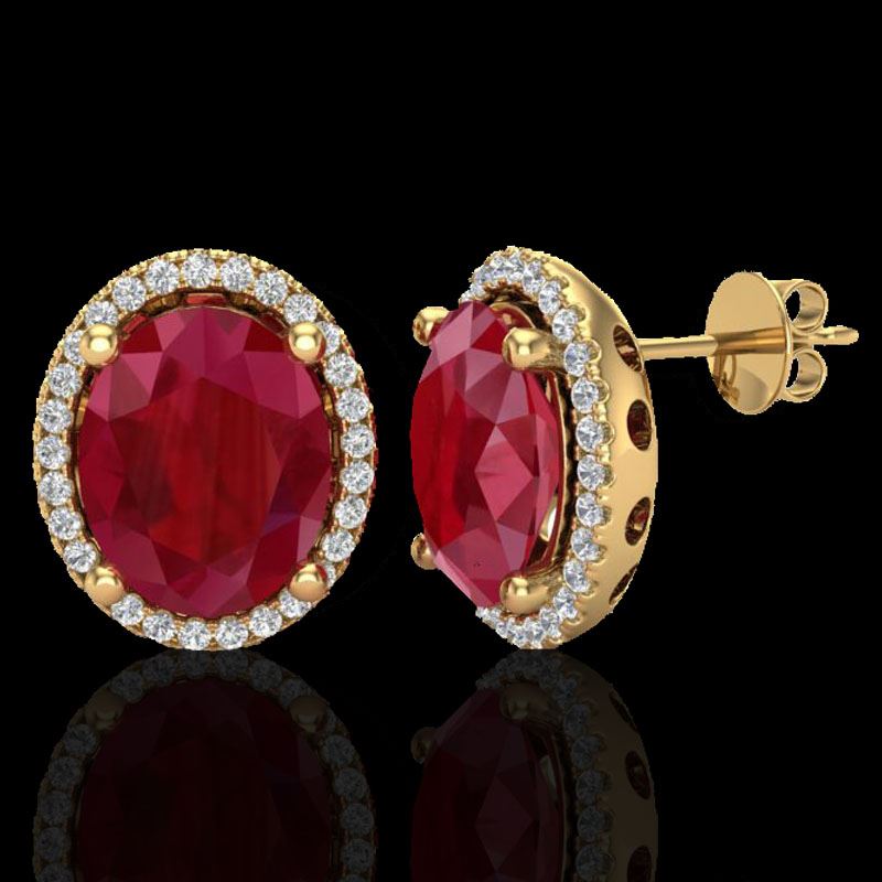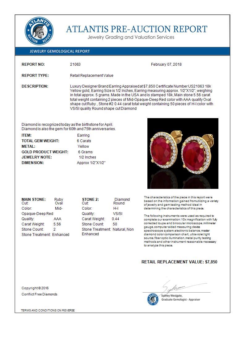REF-101K6W -21063 ---- 6 CTW Ruby & Micro Pave VS/SI Diamond Earrings Halo 18K Yellow Gold ---- Luxury Designer Brand Earring Appraised at $7,850 Certificate Number US21063 18k Yellow gold, Earring Size is 1/2 Inches, Earring measuring approx. 1/2"X1/2", weighing in total approx. 5 grams. Made in the USA and is stamped 18k, Main stone 5.56 carat total weight containing 2 pieces of Mid-Opaque-Deep Red color with AAA quality Oval shape cut Ruby , Stone #2 0.44 carat total weight containing 50 pieces of H-I color with VS/SI quality Round shape cut Diamond