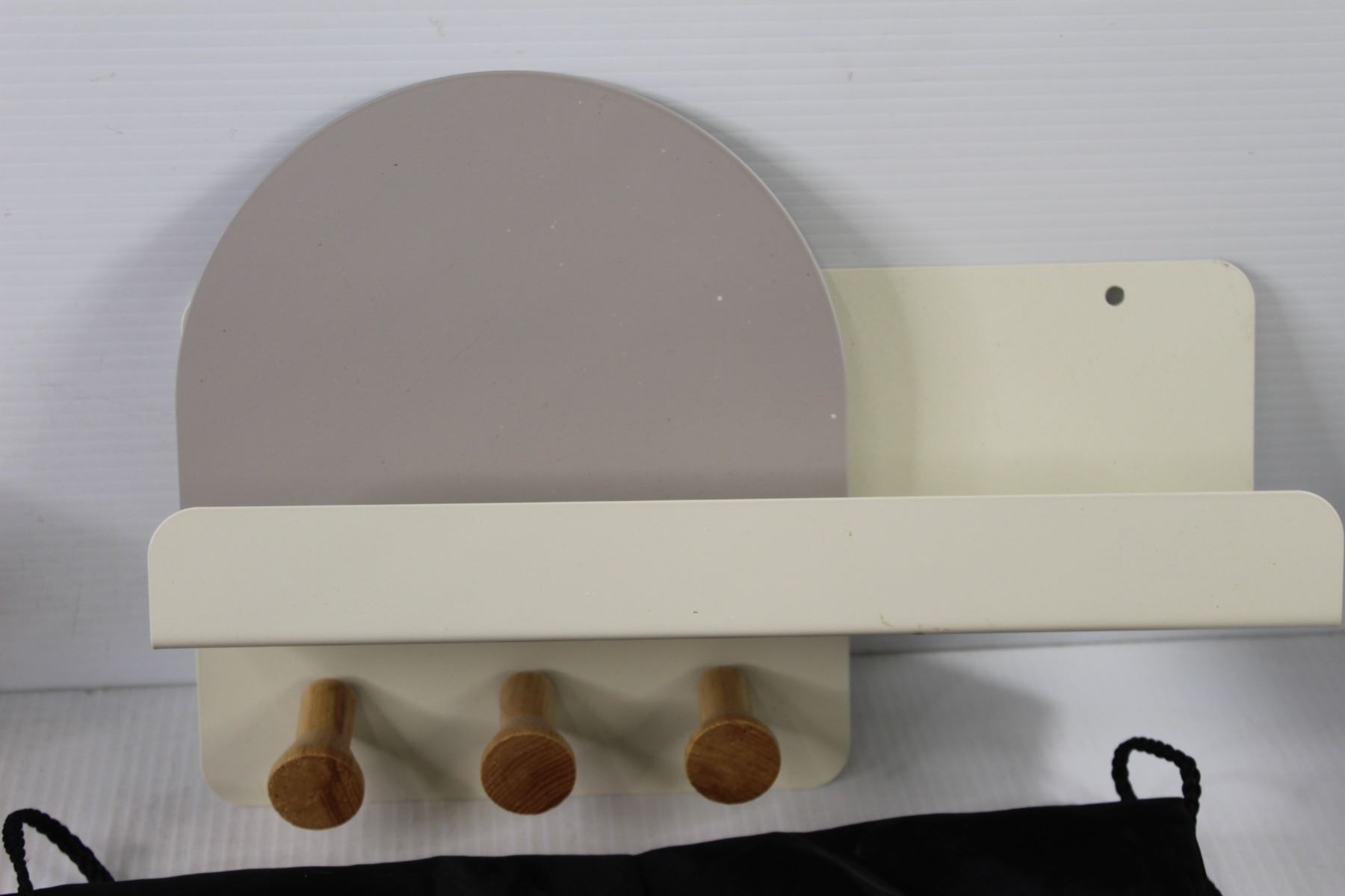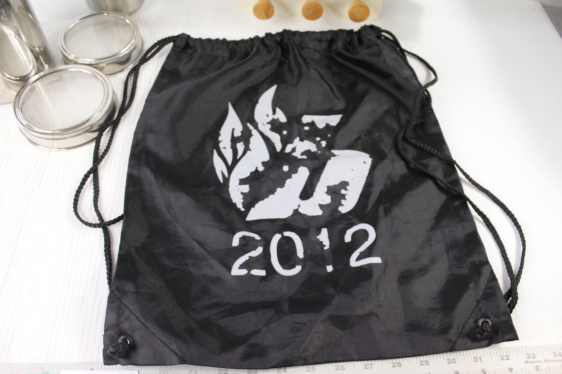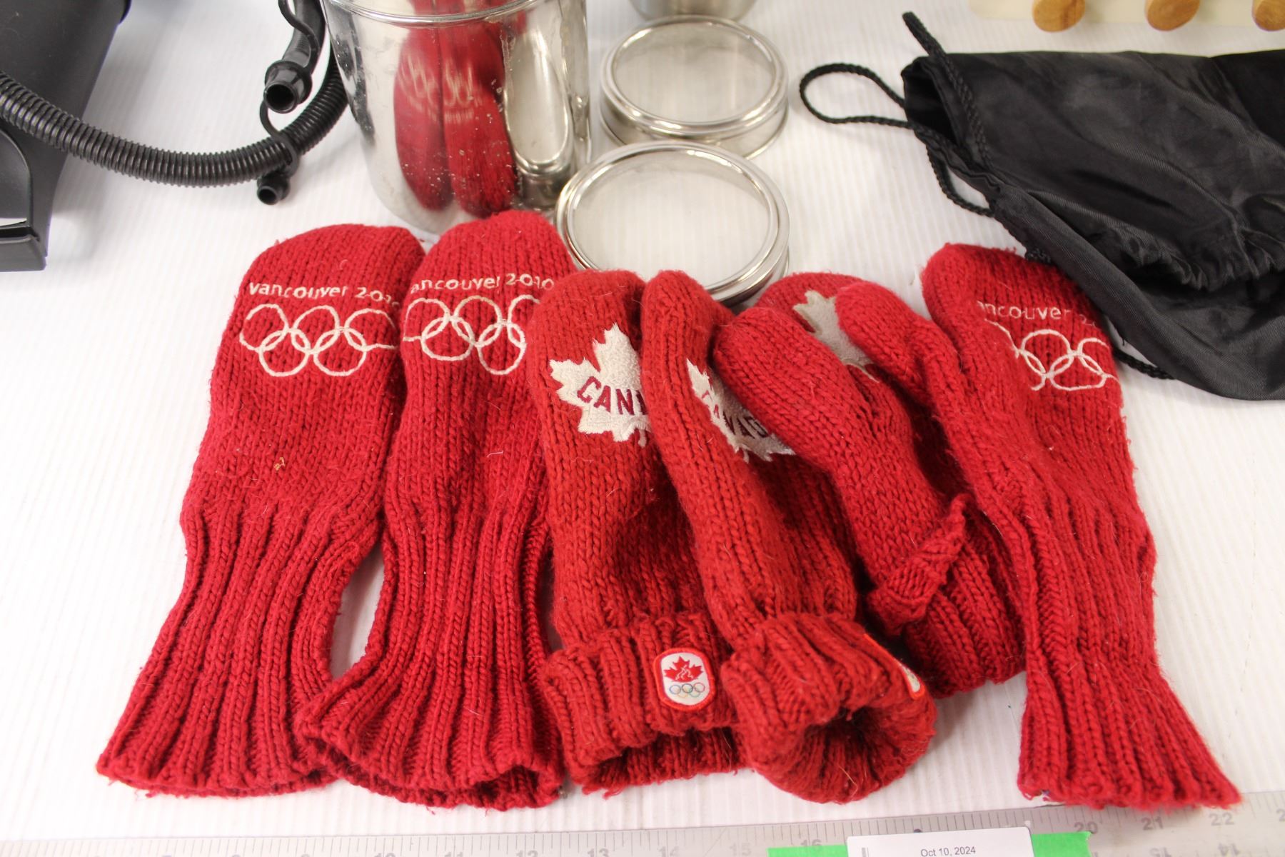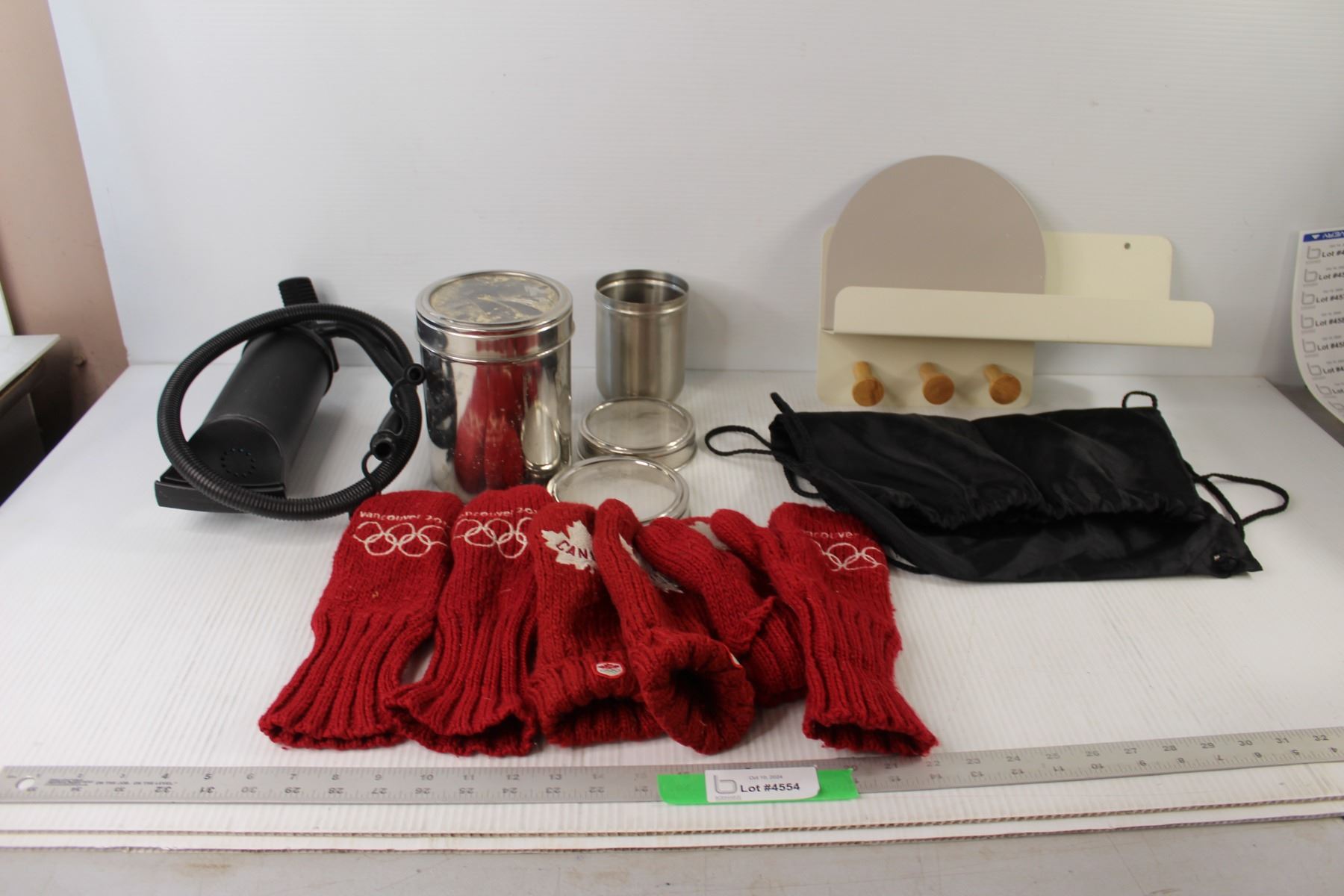 (6) Canada Olympics Mittens, Drawstring Bag, (2) Metal Jars/Storage, Shelf, Air Pump