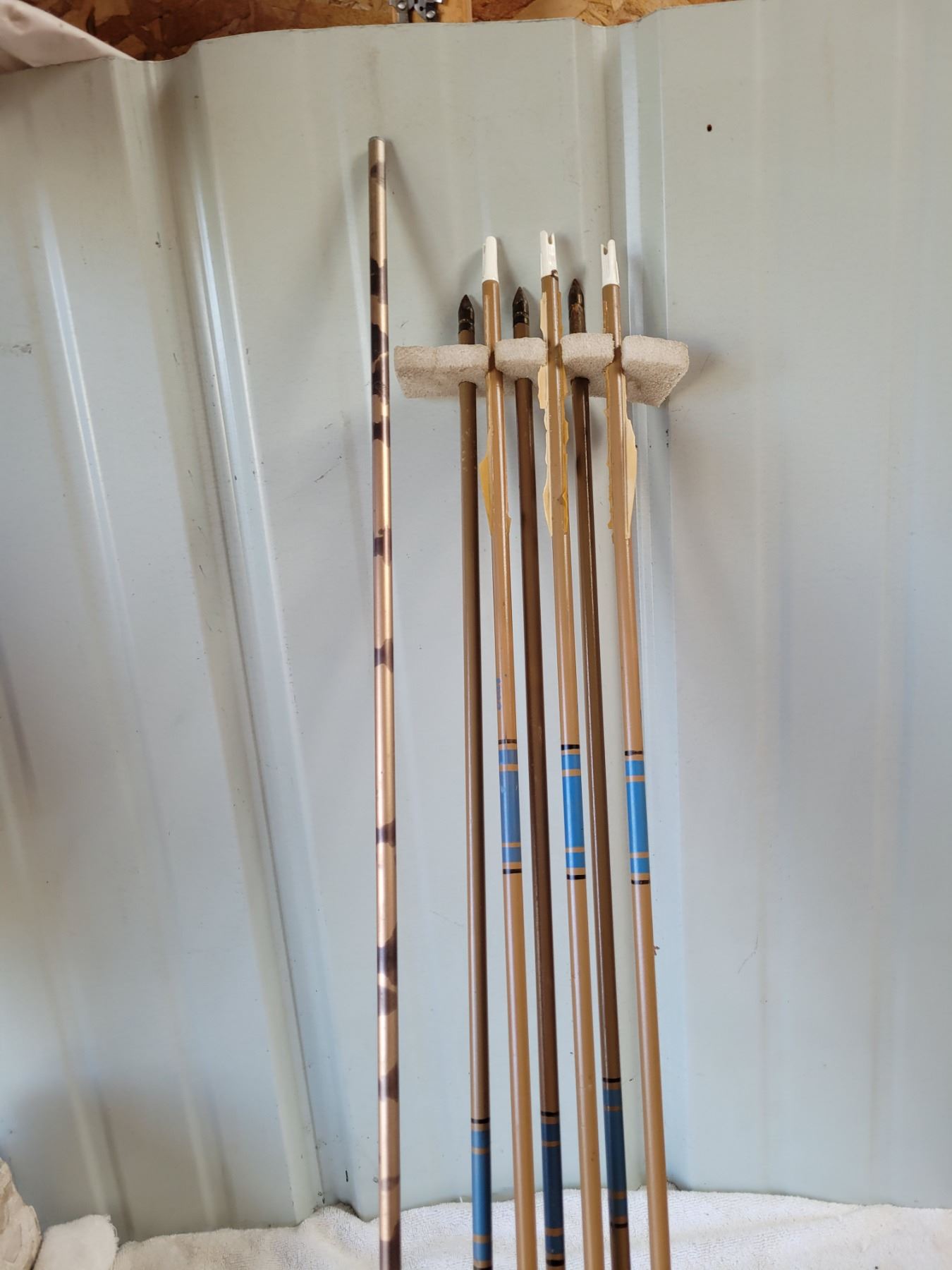 6 Cedar arrows, 28" - needs fletching, 1 aluminum hunting arrow, 32" - Easton Gamegetter, needs flet