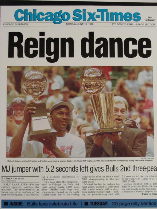 These are reprints of the original Chicago Sun Times covers from the six Chicago Bulls World Championship victories. Each is 11 x 14 inches, in full color on glossy paper. They're in very good condition, ready to be framed. With Michael Jordan, Phil Jackson, and those gleaming trophies, the images are full of emotional intensity.