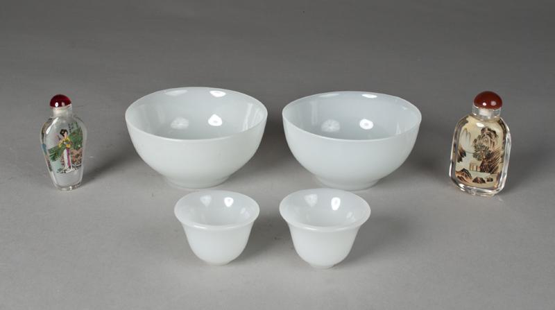 Includes two white glass bowls, two white glass tea cups, and two reverse painted snuff bottles, one with figure and other with landscape. Largest 2 & 1/8" H x4 & 5/8" Dia. 20th century.