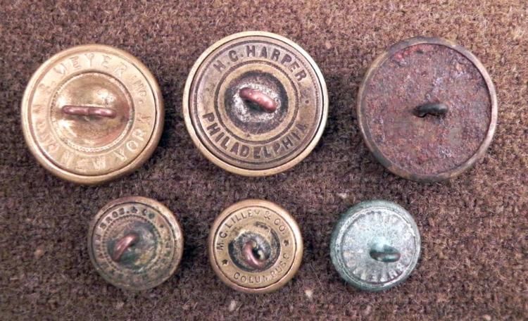 6 Civil War Eagle Gilt Coat Buttons, dating from just after the Civil War * * Obverse: Eagles, including banner, anchor, starsReverse: Maker names include: Horstmann Bros & Co., Philadelphia, H.C. Harper, Philadelphia, M.C. LILLEY & CO., COLUMBUS, O., N.S. Meyer Inc. New YorkSuperior Quality * Diameter: 15 and 22 mmCondition: Good to Very Good, with some minor surface wear, one with dent, one with oxidation on the reverse, and two with slightly bent shanks