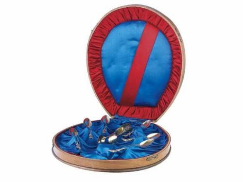 Gilt silver, 77 g. Twisted handles with mascarons at the end, original wooden ox with silk lining. The sugar tongs are replacements from the same period. Marked: Austrian, circa 1880.