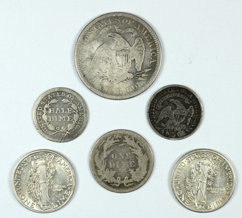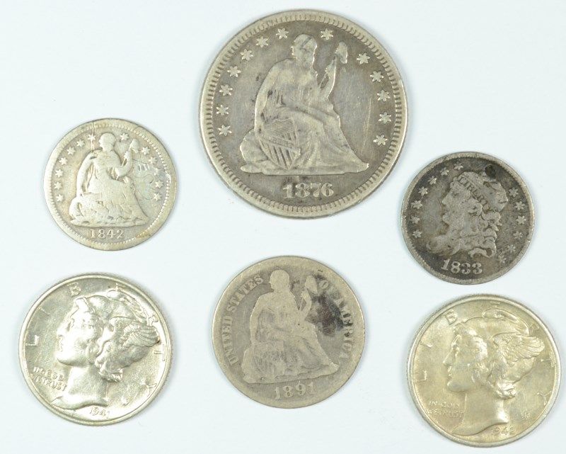 6 Coin Lot: 1876 QUARTER VF, 1891 DIME GOOD, 1842 1/2 DIME GOOD, 1833 HALF DIME