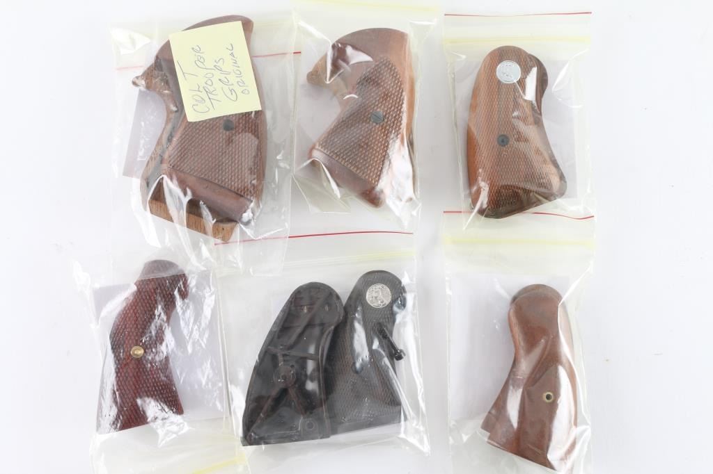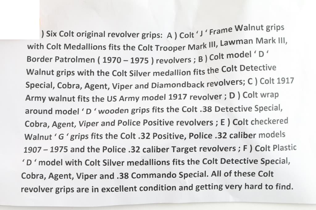 6 Original Colt revolver grips, J frame walnut with colt medallions fits Trooper mark III. Lawman mark III, Border Patrolmen (1970-1975) revolvers;B). Colt model 'D'. Walnut grips with Colt silver medallions fits Colt Detective Special, Cobra, Agent, Viper and Diamondback; C) Colt 1917 Army walnut fits the Army model 1917 revolver ;D). Colt wraparound model,D. wooden grips the Colt 38 Detective Special, Cobra, Agent, Viper, Police Positive revolvers E). Colt checkered walnut 'G' grips fit Colt 32 Positive, Police 32 caliber 1907-1975 and Police 32 target revolvers; F). Colt Plastic 'D' model Colt silver medallions for Colt Detective Special, Cobra, Agent, Viper,and 38 Commando Special. All of these Colt revolver grips are in excellent condition and getting very hard to find
