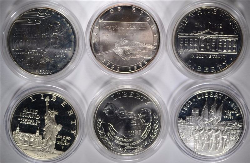 6-Commemorative Silver Dollars - No Packaging, just a capsule: 1992 White House Unc. Dollar, 1986 Liberty Proof Silver Dollar, 1991 Bill of Rights Unc Dollar, 1991 Korean War Unc Silver Dollar, 2002 West Point