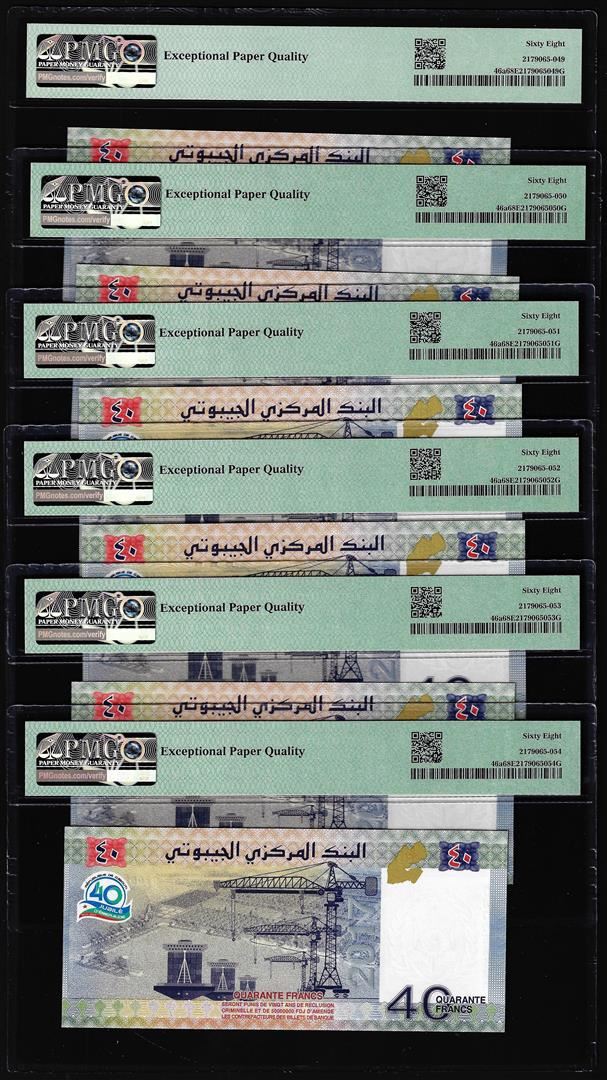 One (6) Consecutive 2017 Djibouti 40 Francs Bank Notes PMG Superb Gem Uncirculated 68EPQ. PMG Certified.