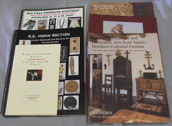 6 Cowboy And Indian Soft Back Auction Catalogs. 1. Scottsdale Art Auction April 1, 2006, American Furniture and Decorative Arts from Spain's Northern Colonial Frontier 1700-1900. 2. The Collection of Mr. and Mrs. Al Luckett, Jr. ''Sotheby's NY'', Thursday January 15, 1998. 3. Tiny Satellite Press Cattle Track Press, Catalog 2007. 4. Ancient and Tribal Art, Monday February 16, 2009, San Francisco. 5. R. G. Munn Auction, Native American and Western Art Tucson Arizona, March 2008. 6. Allard Auctions Inc. Indian and Related Material, November 16, 17, & 18, 2007. Largest measures approx.. 11'' x 8.5''. SHI $20.