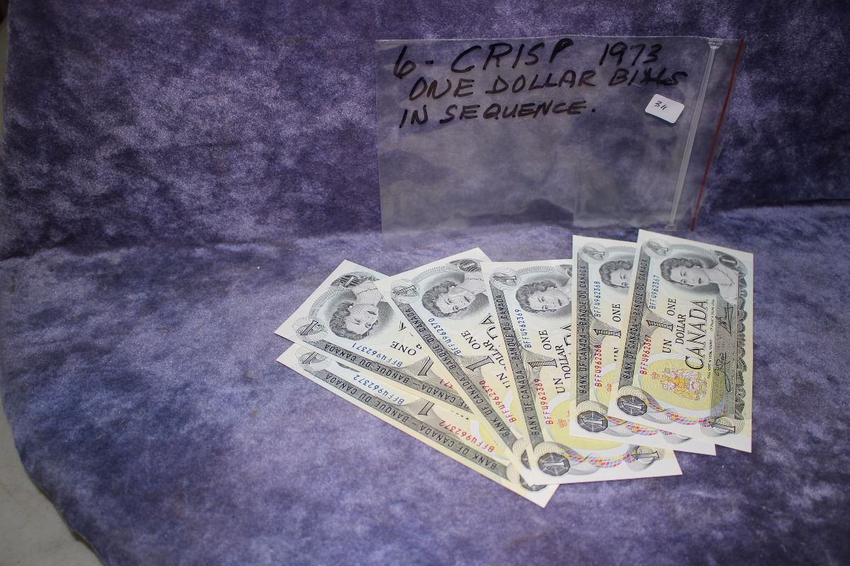 6 Crisp 1973 Cdn. One Dollar Bills - in Sequence